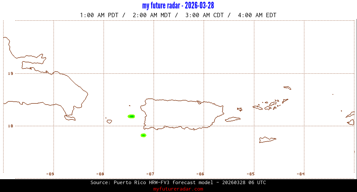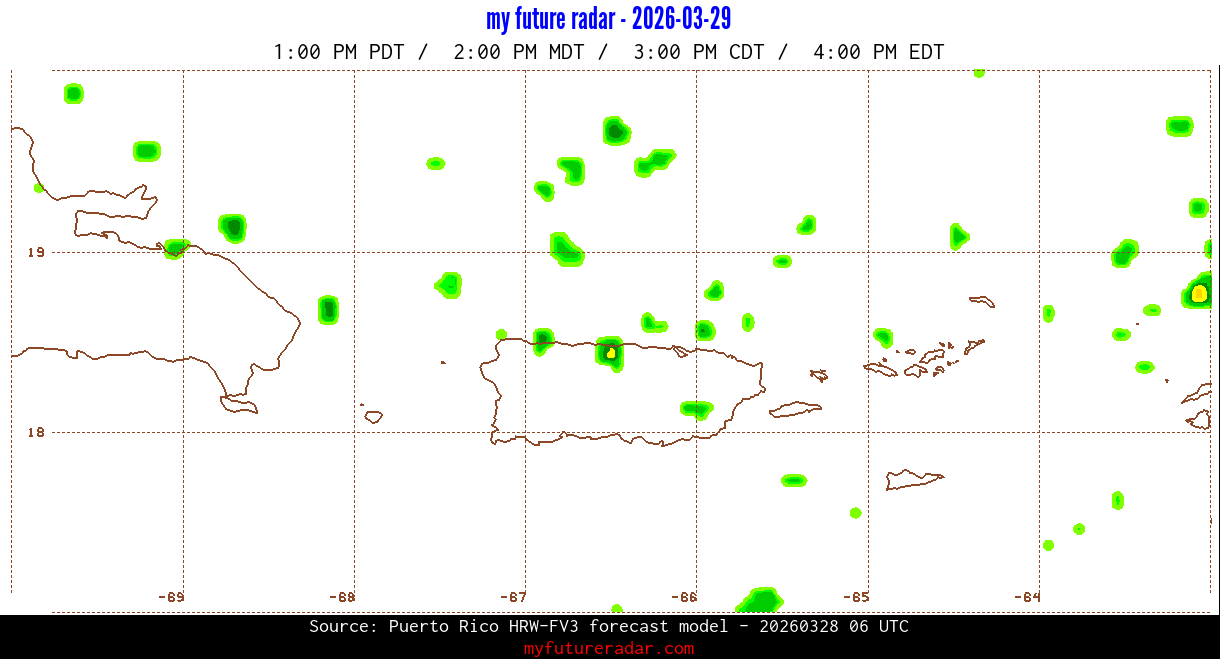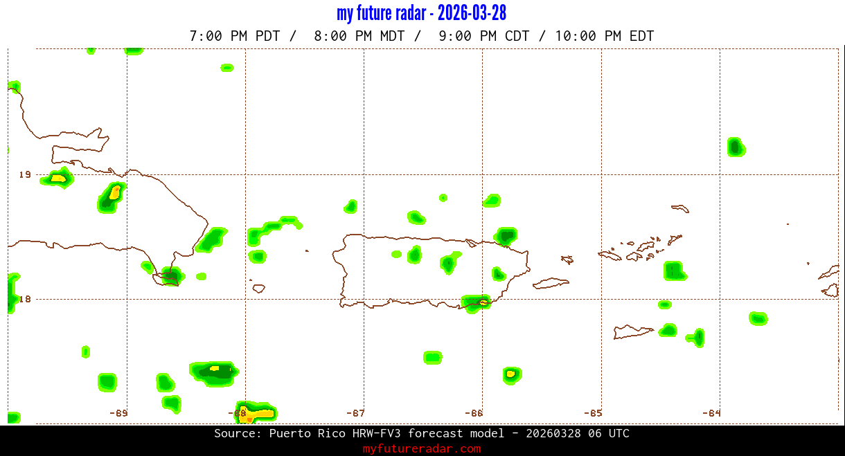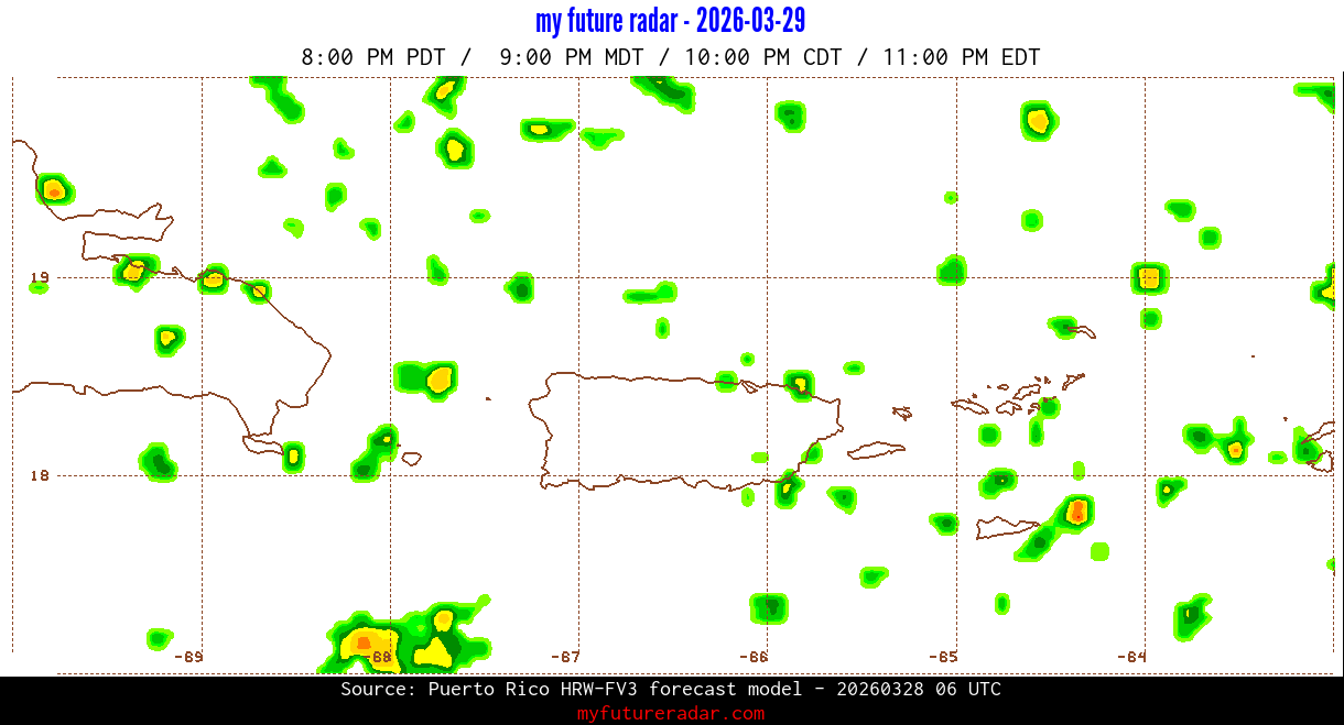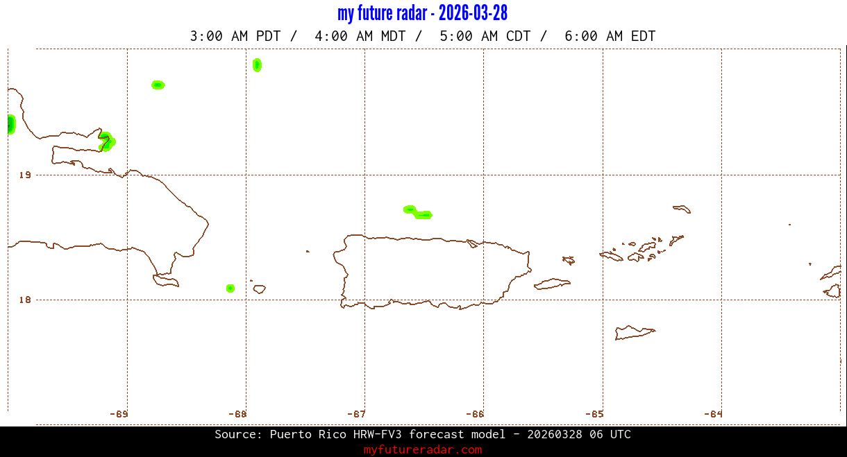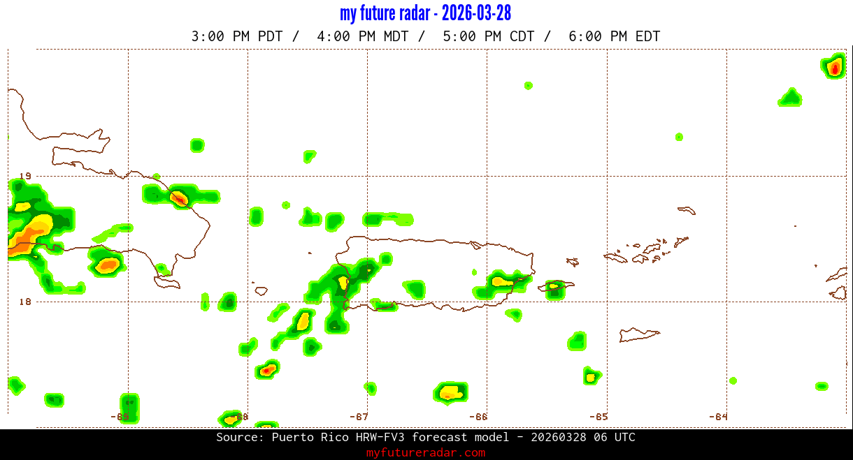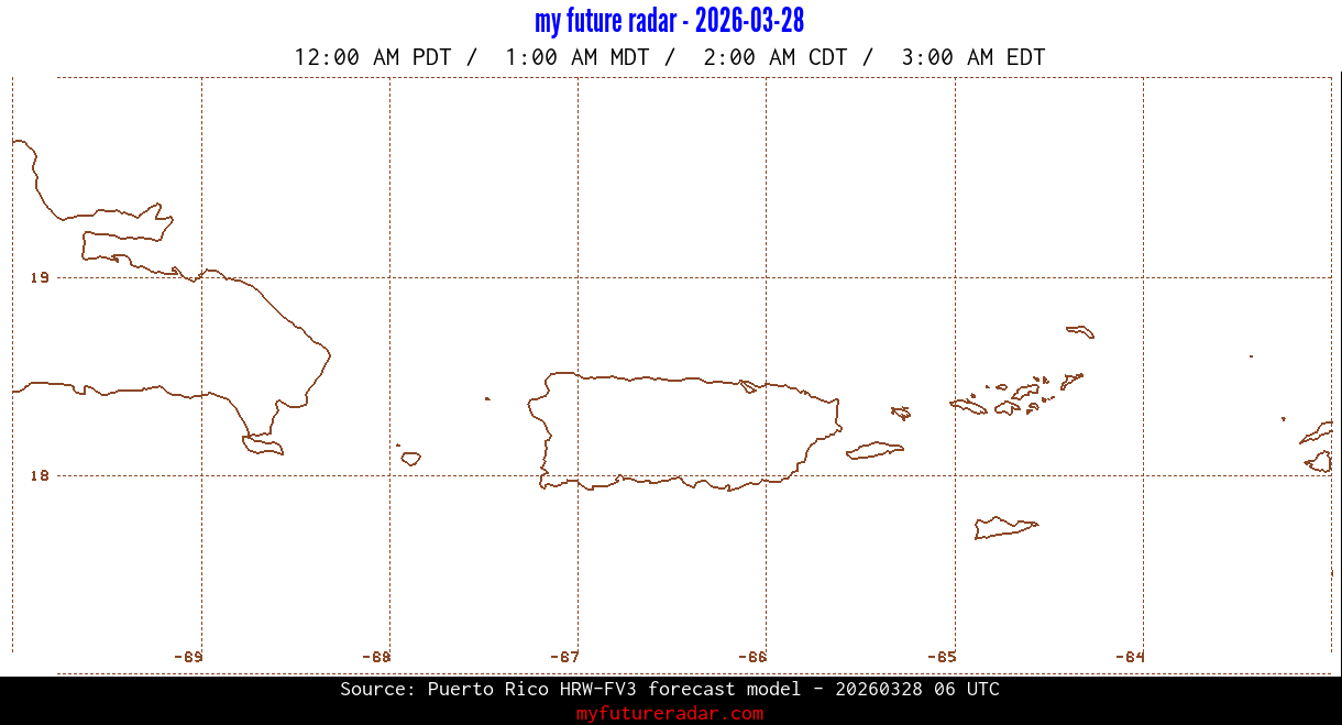 You are on the page that displays data from the Puerto Rico HRW-FV3 forecast model. Currently, we have radar imagery for this model from now until .