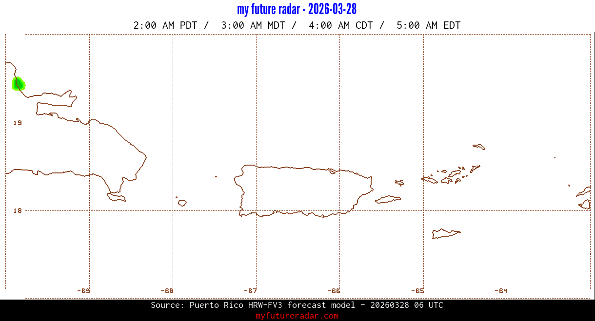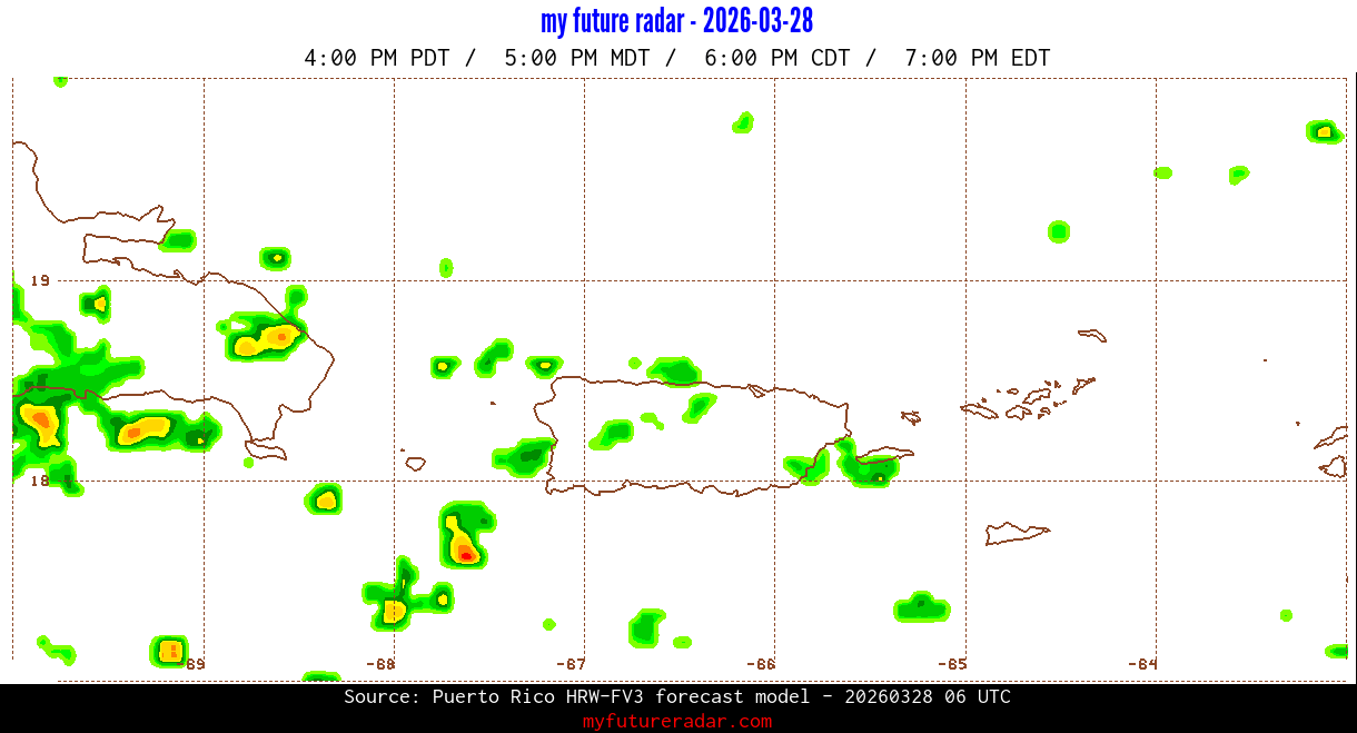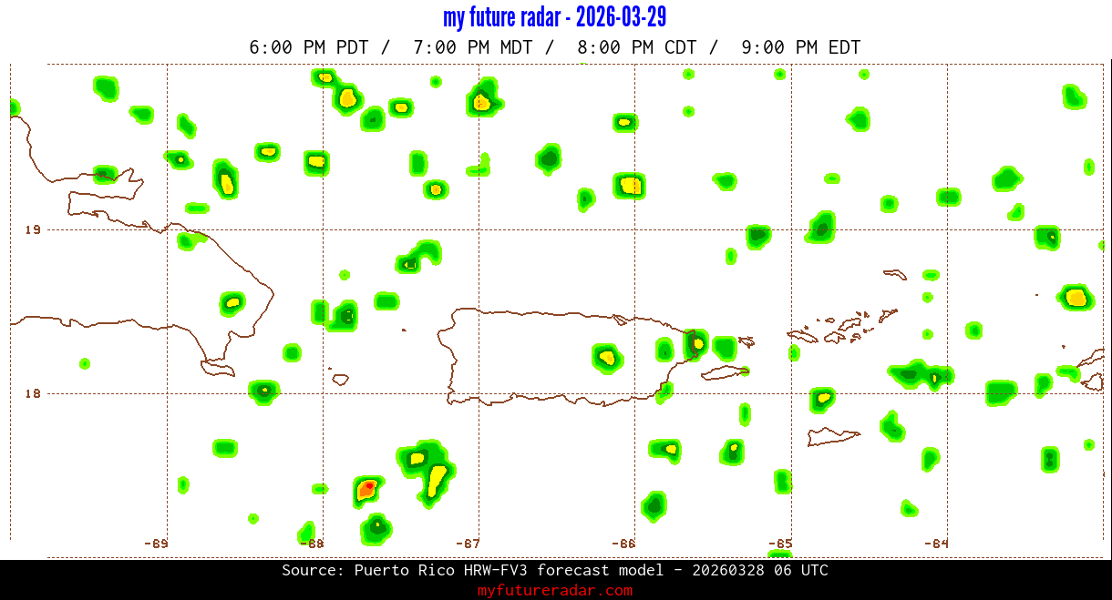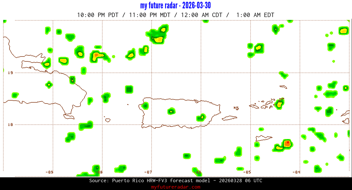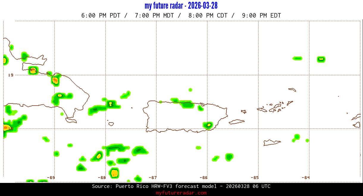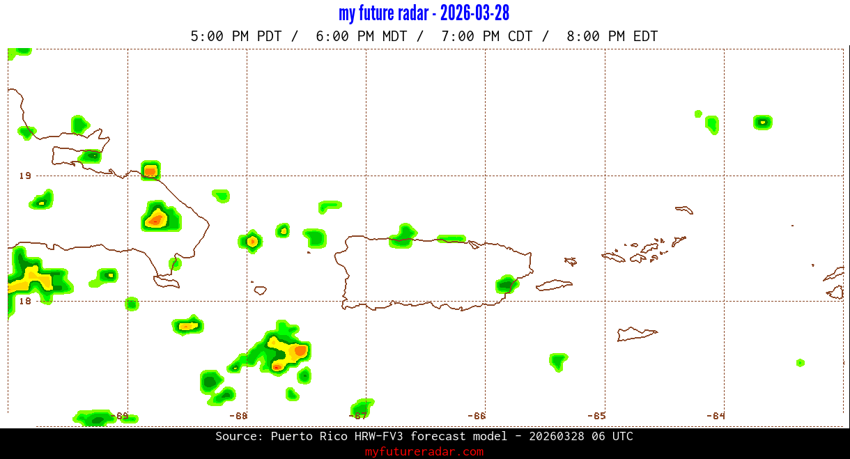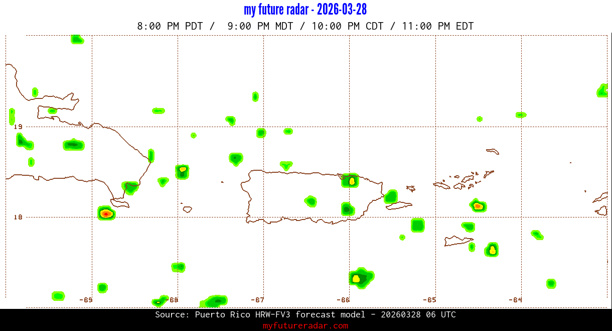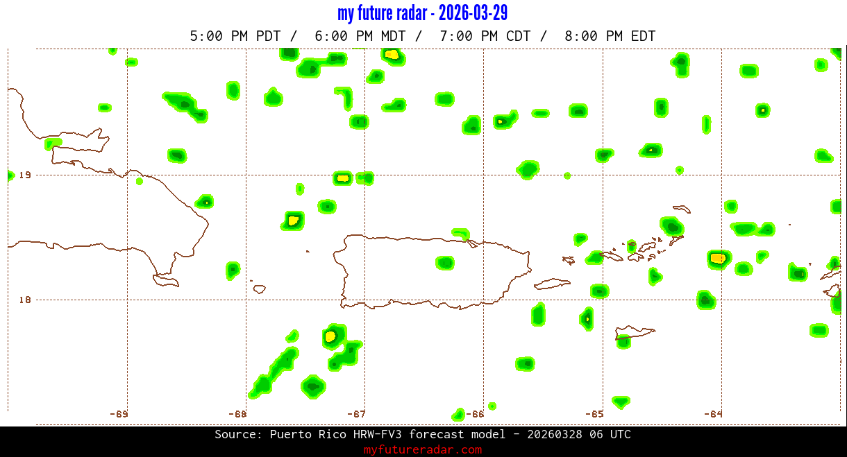You are on the page that displays data from the Puerto Rico HRW-FV3 forecast model. Currently, we have radar imagery for this model from now until .