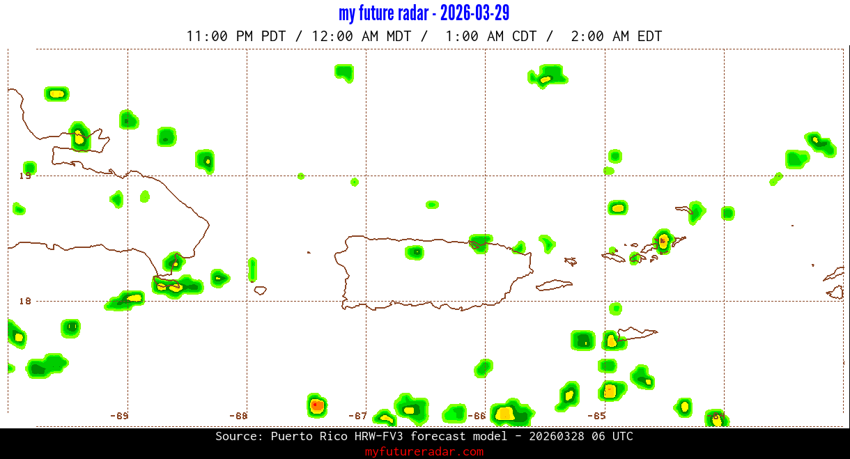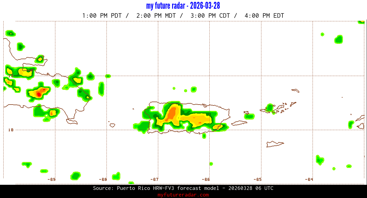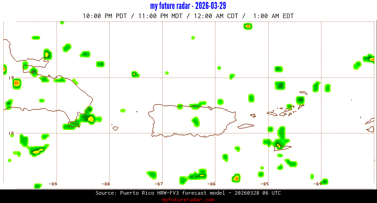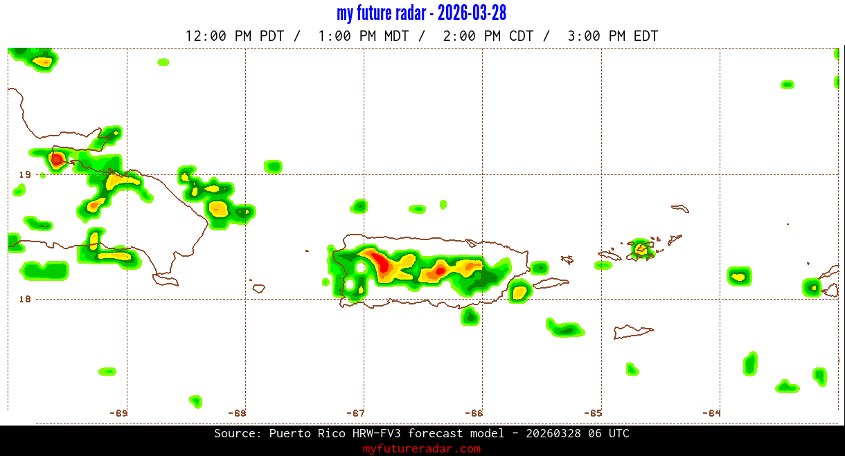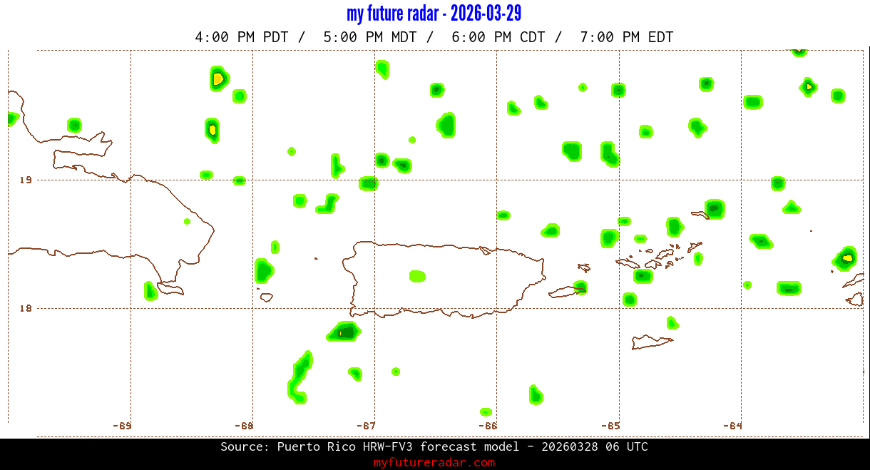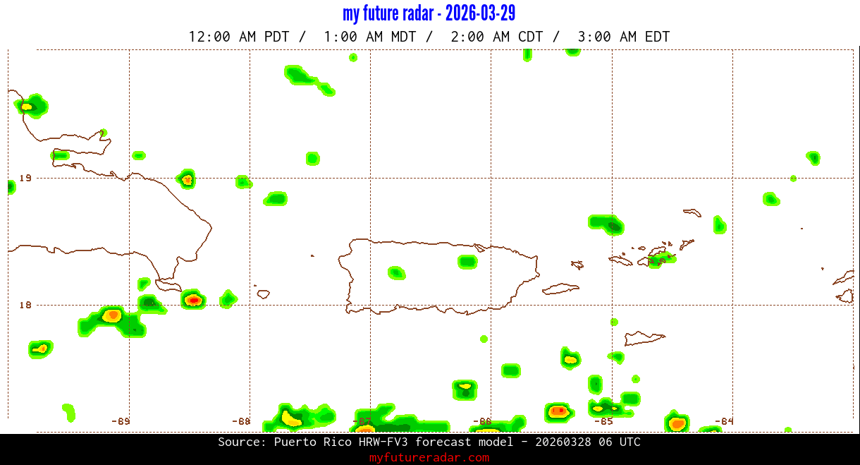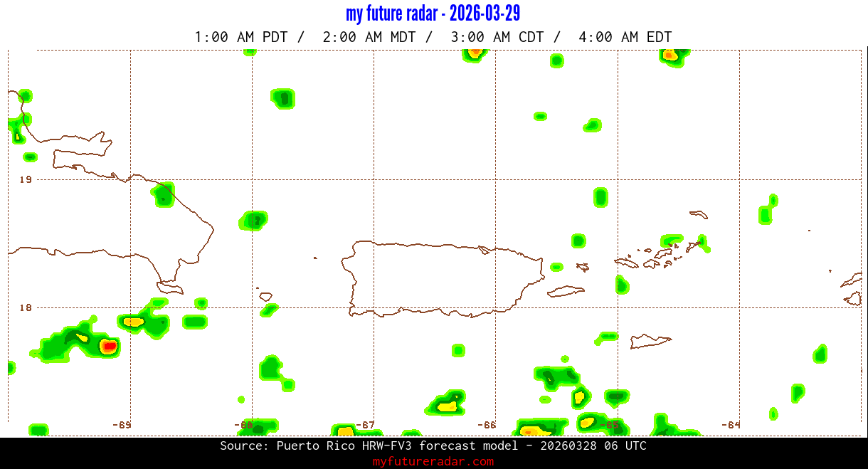 You are on the page that displays data from the Puerto Rico HRW-FV3 forecast model. Currently, we have radar imagery for this model from now until .