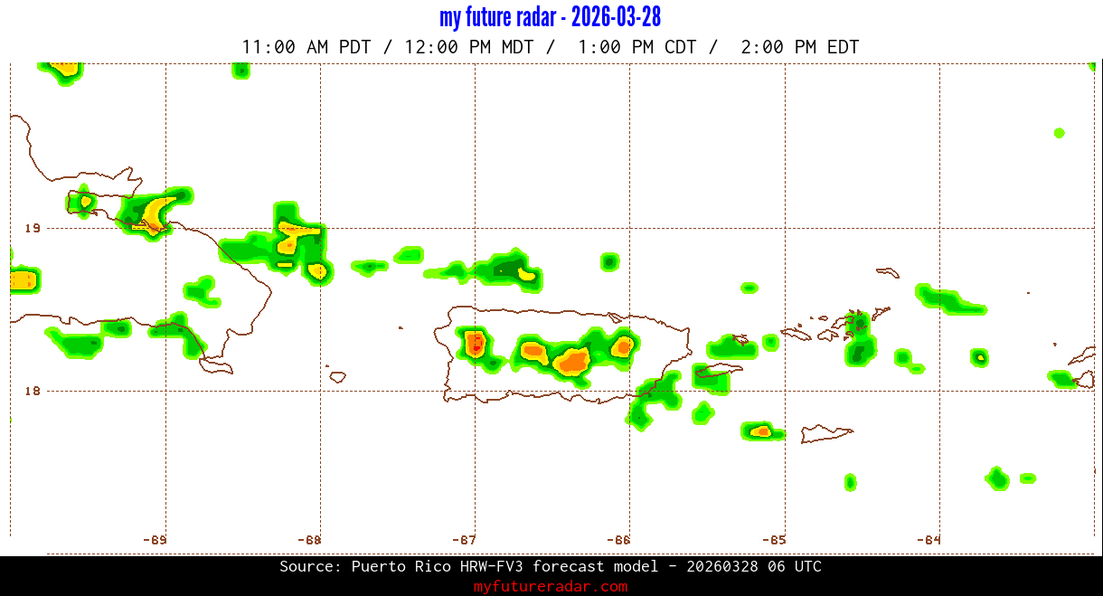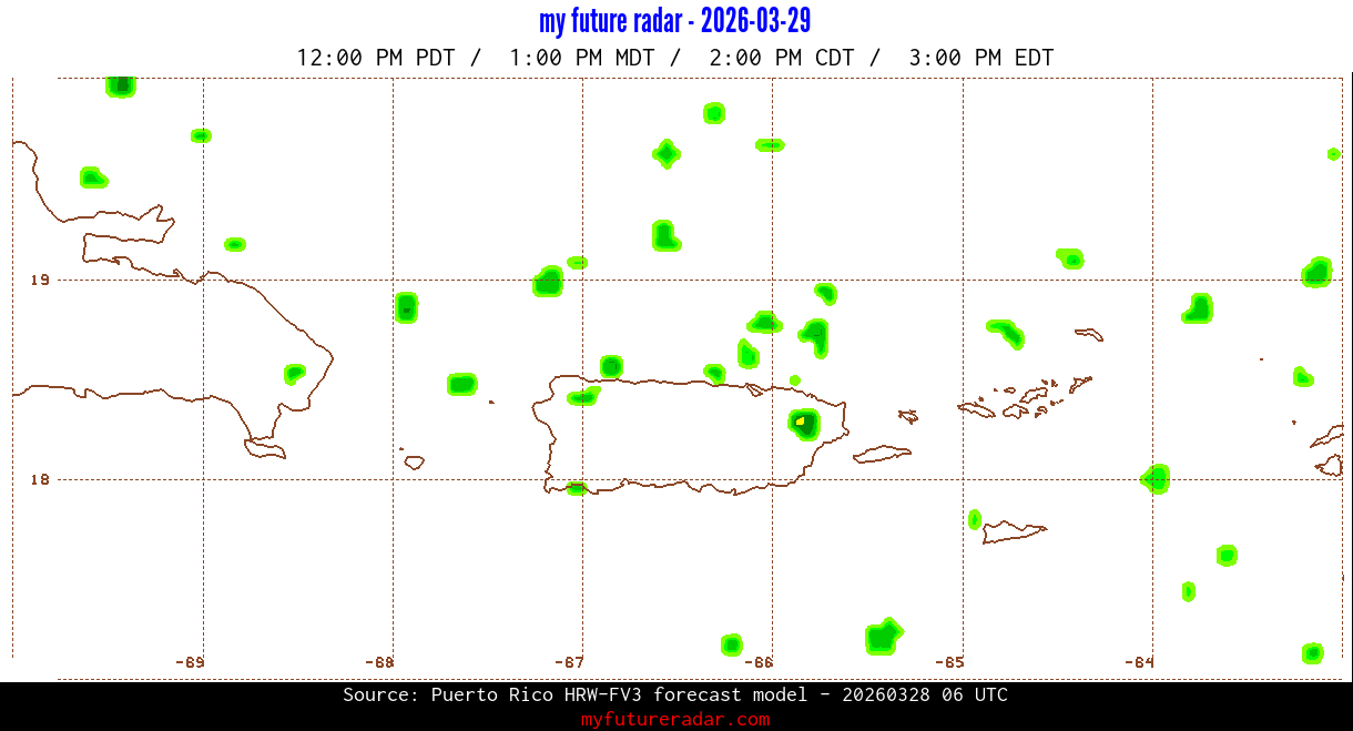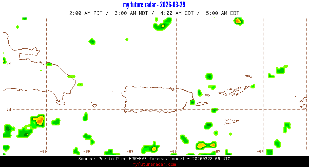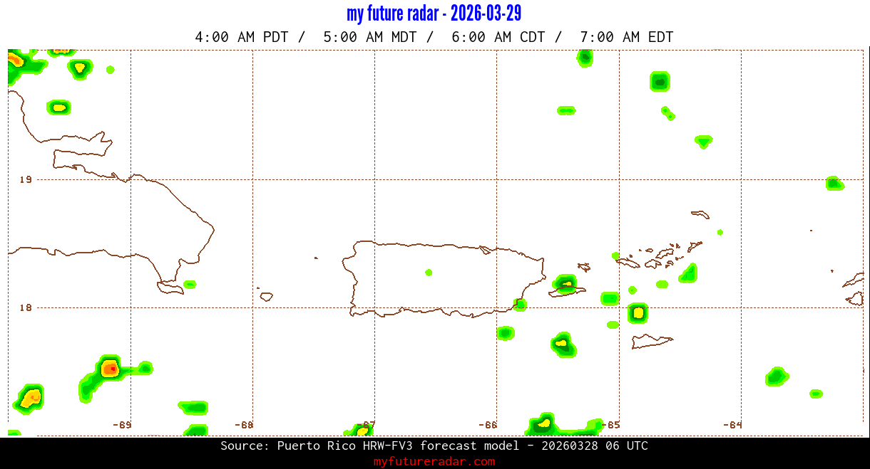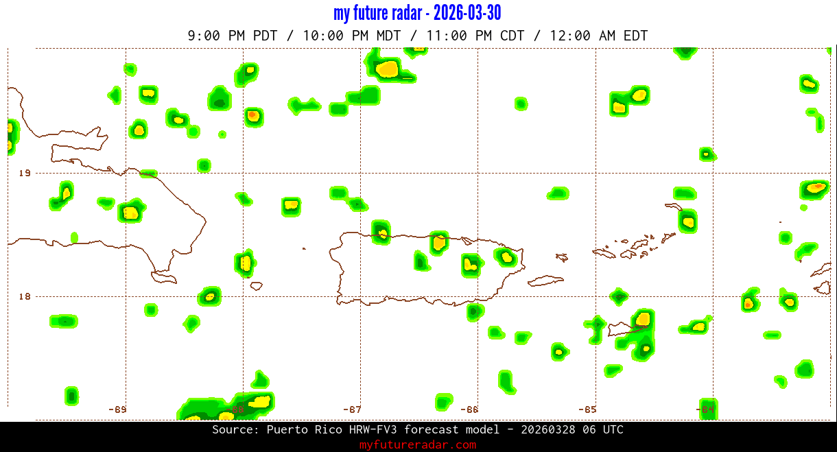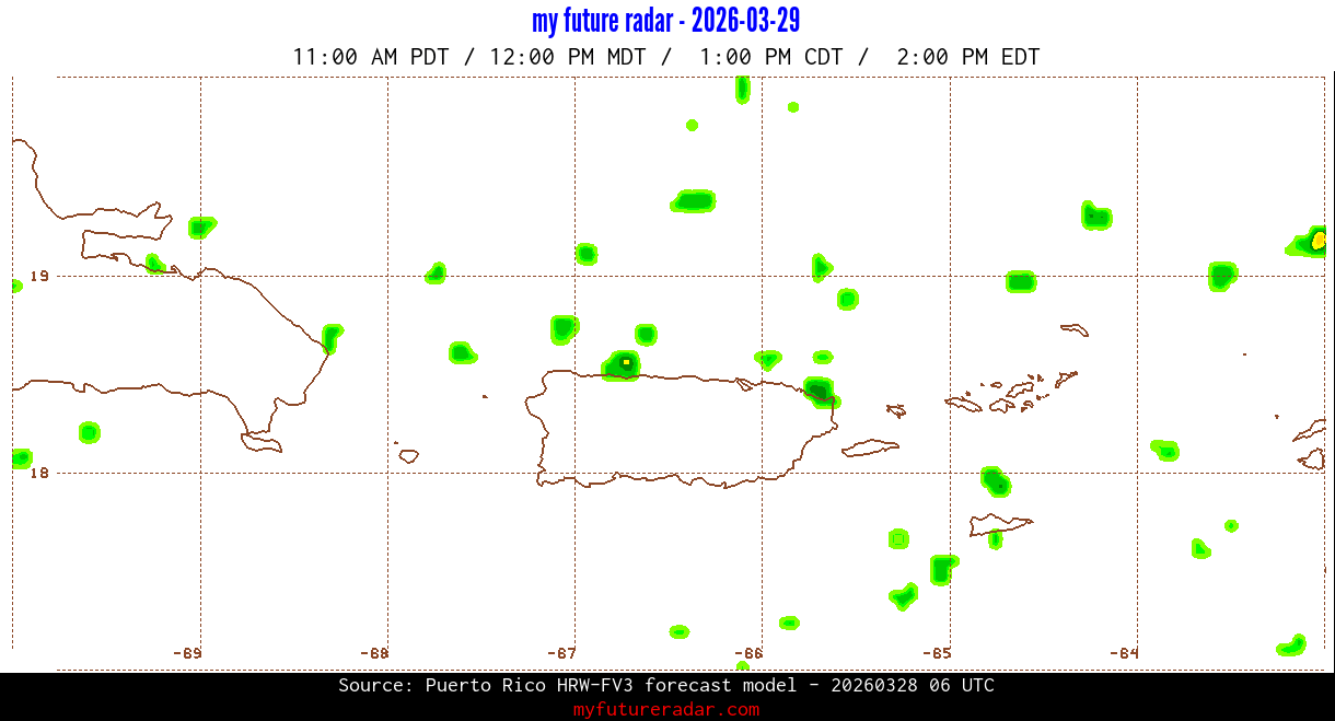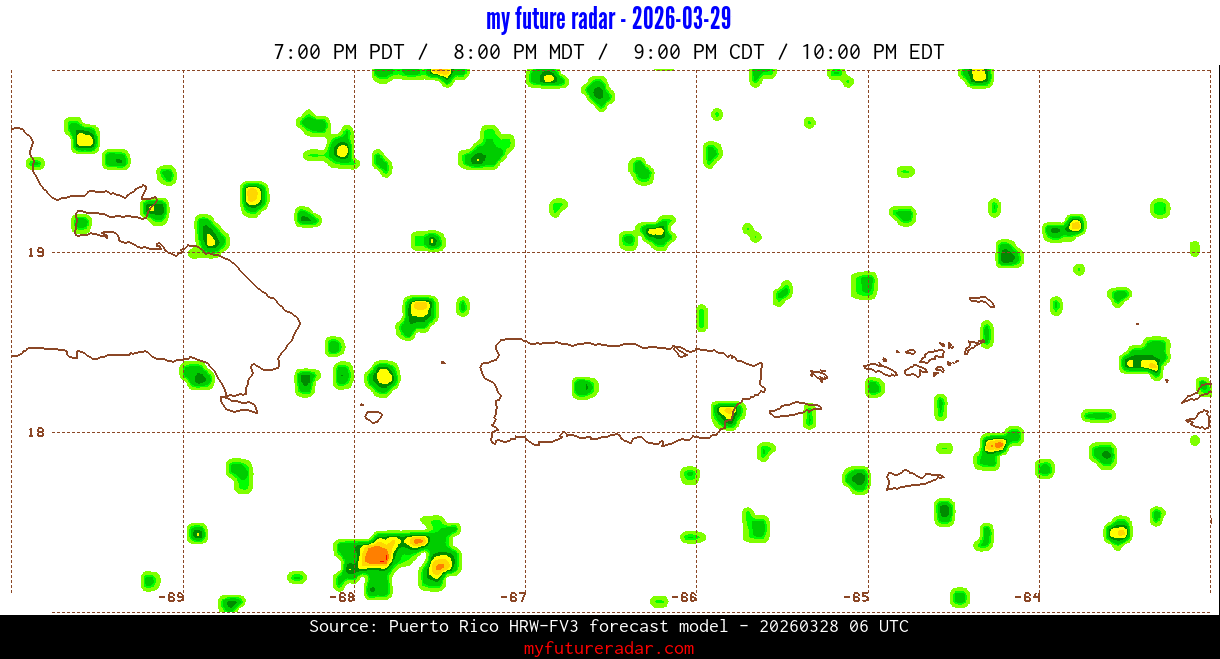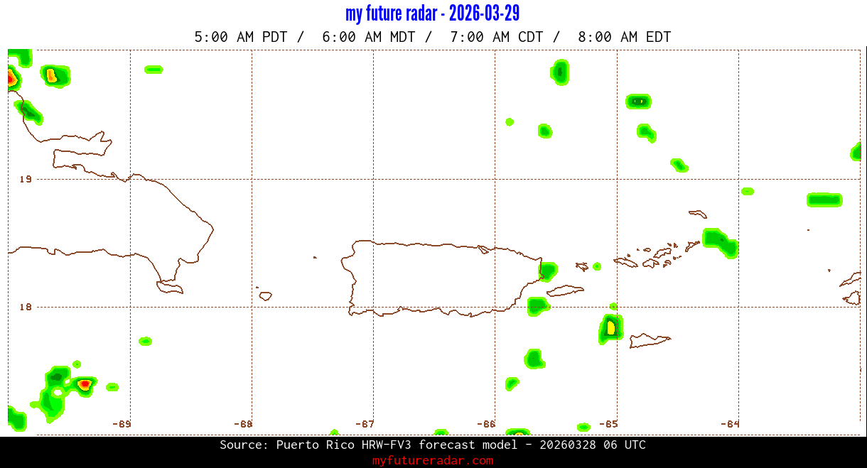 You are on the page that displays data from the Puerto Rico HRW-FV3 forecast model. Currently, we have radar imagery for this model from now until .
