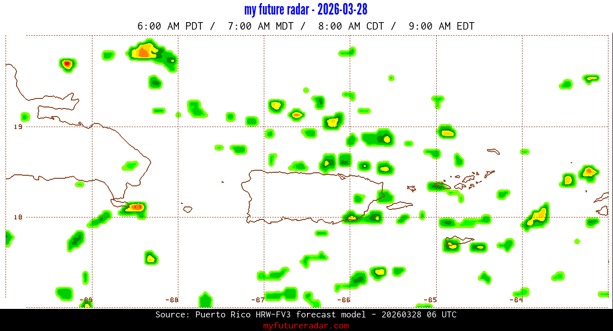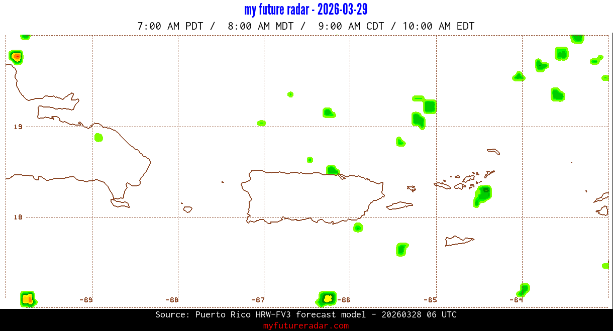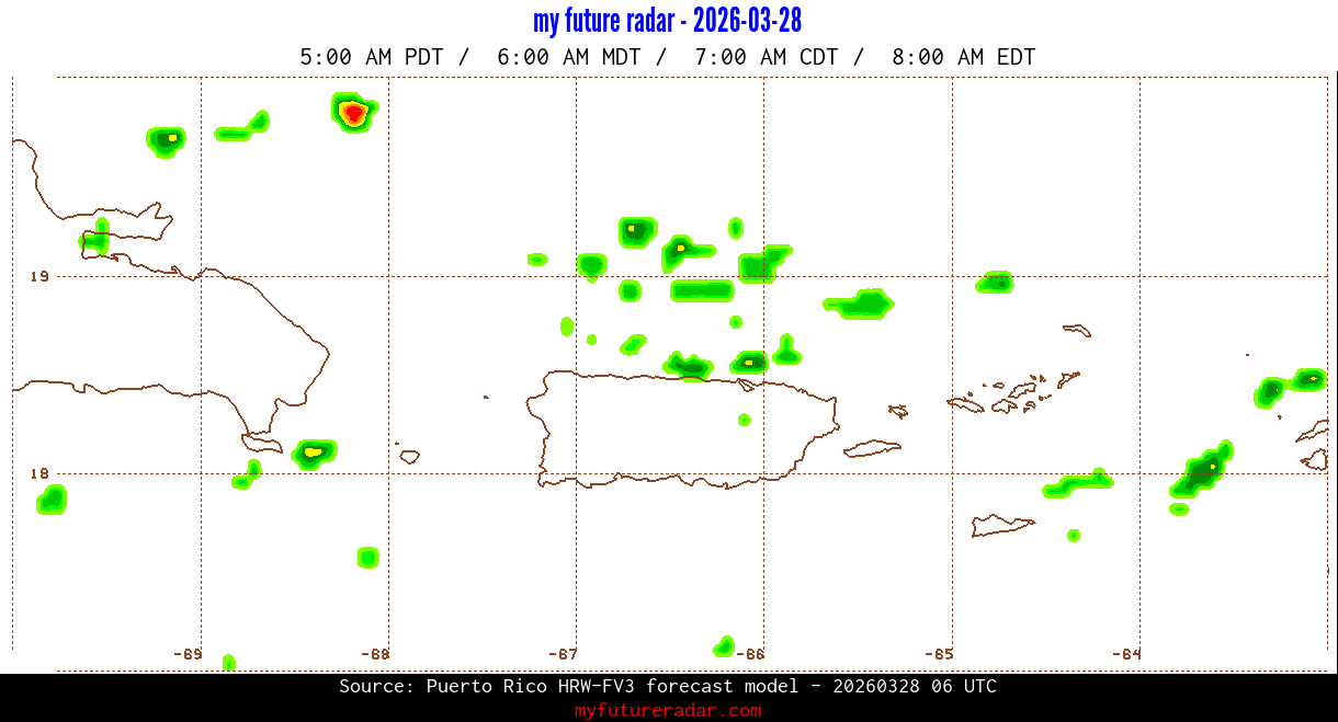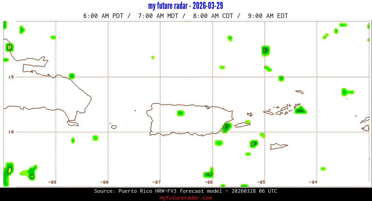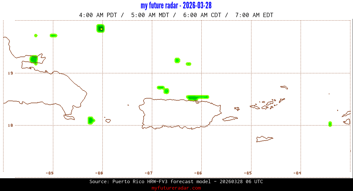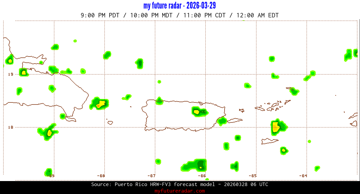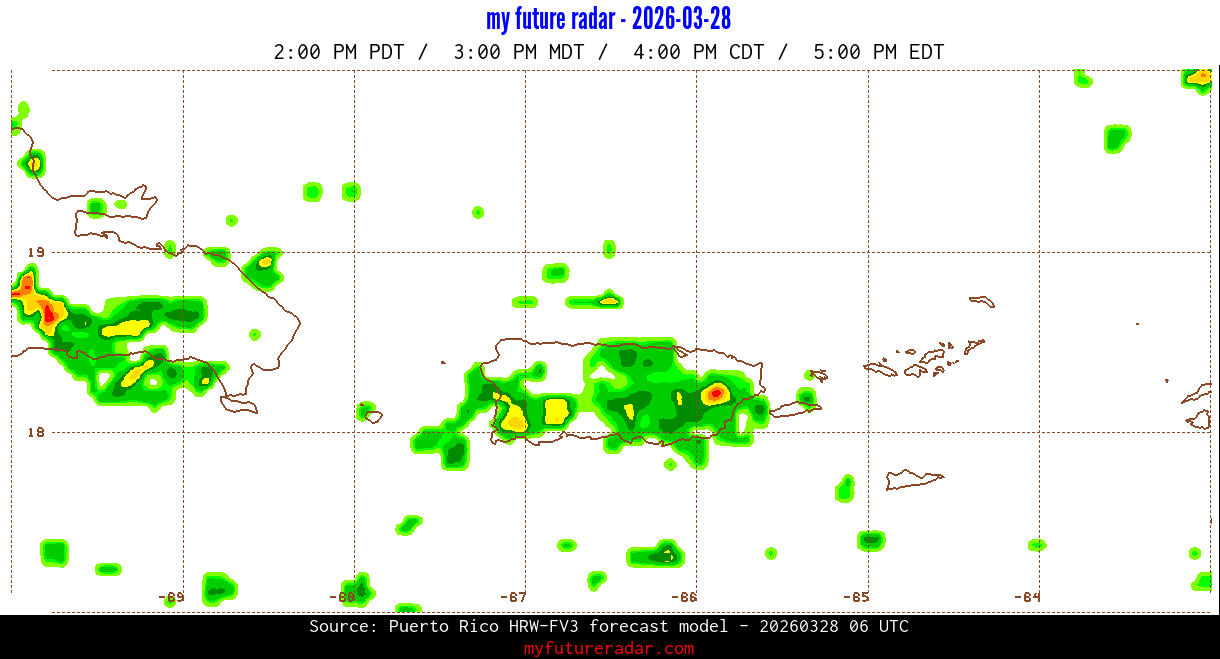 You are on the page that displays data from the Puerto Rico HRW-FV3 forecast model. Currently, we have radar imagery for this model from now until .