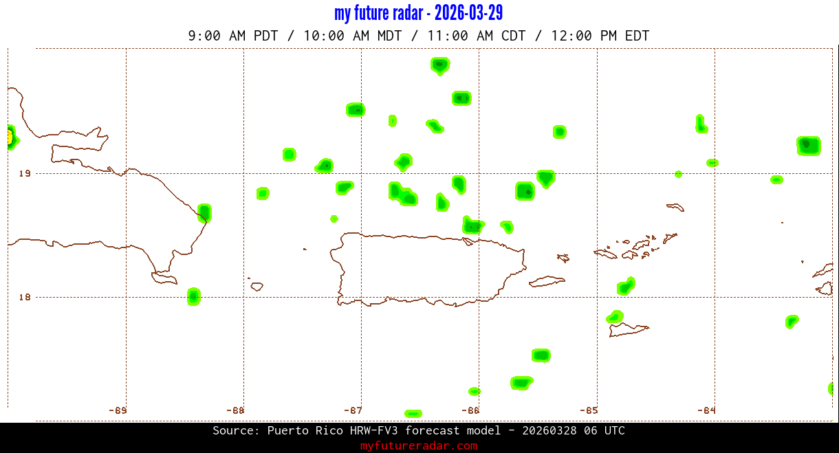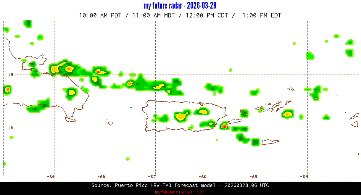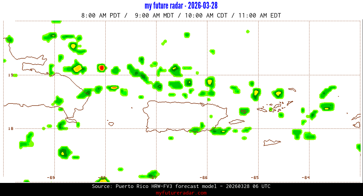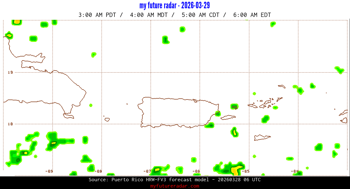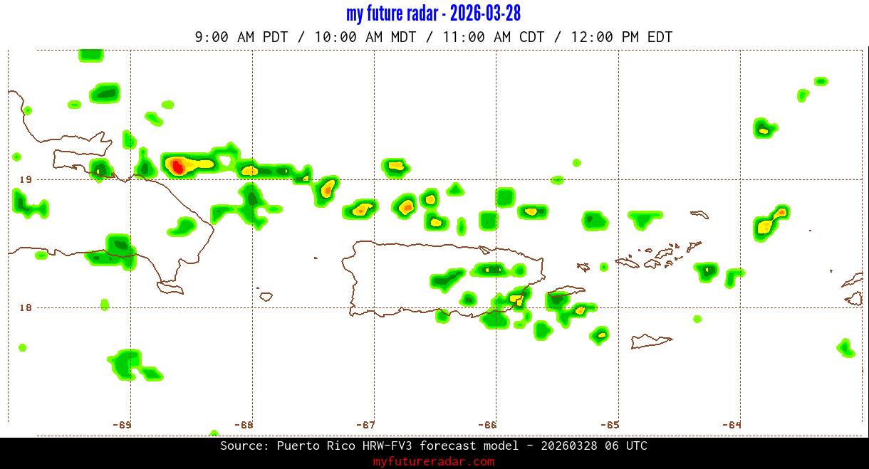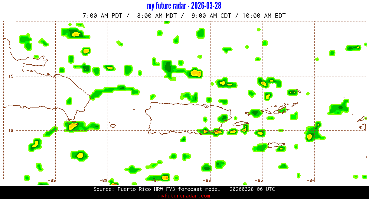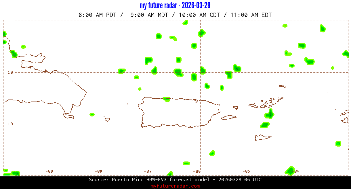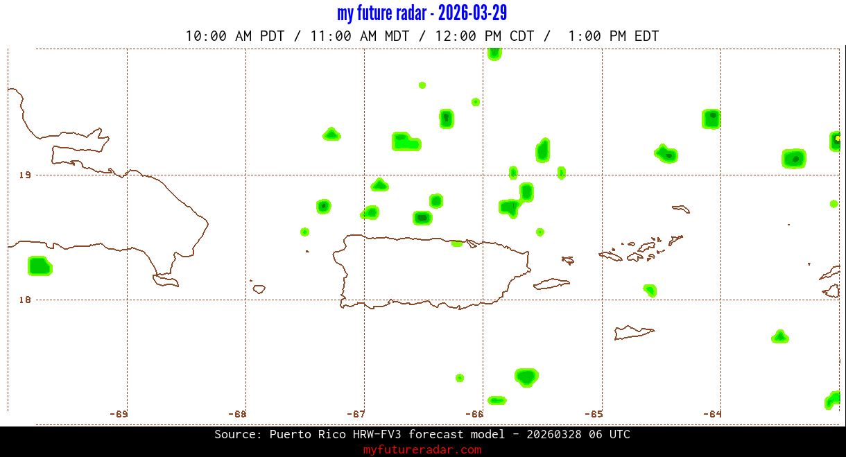 You are on the page that displays data from the Puerto Rico HRW-FV3 forecast model. Currently, we have radar imagery for this model from now until .