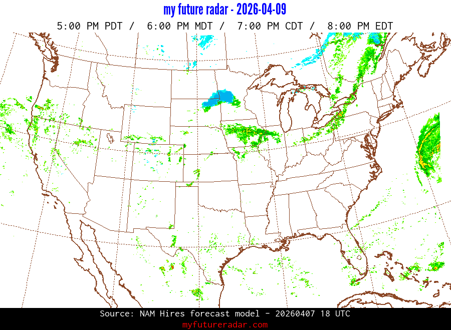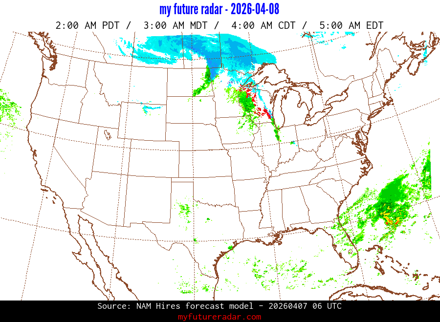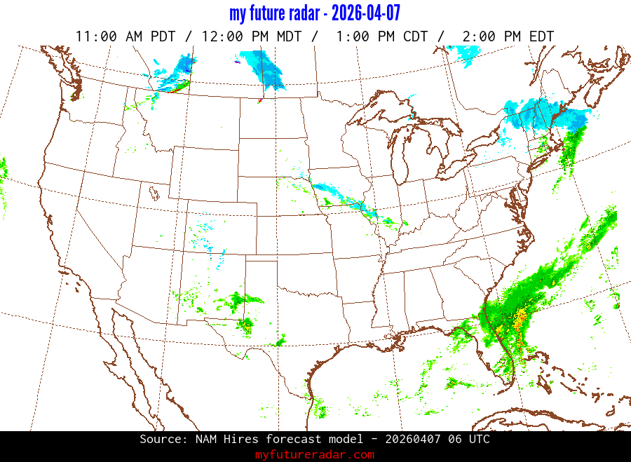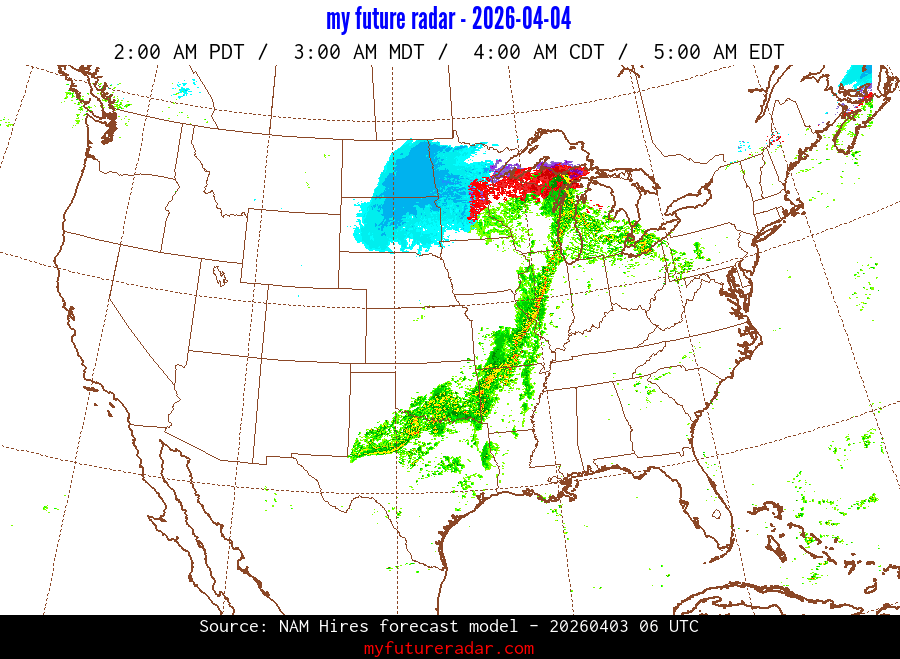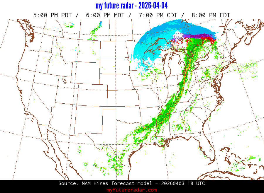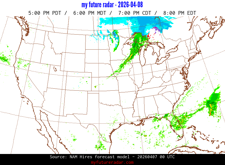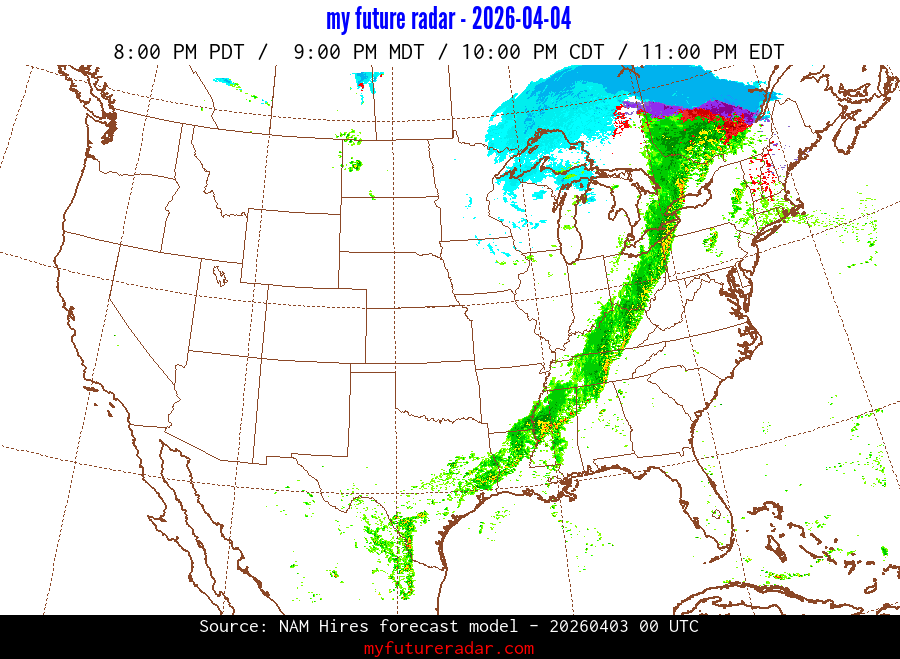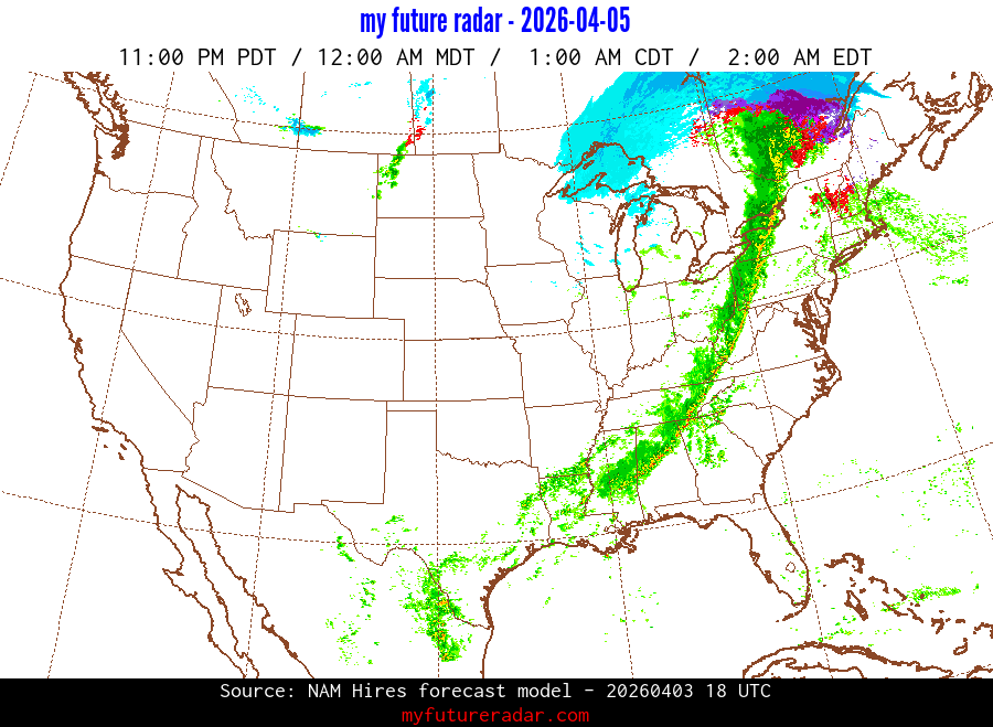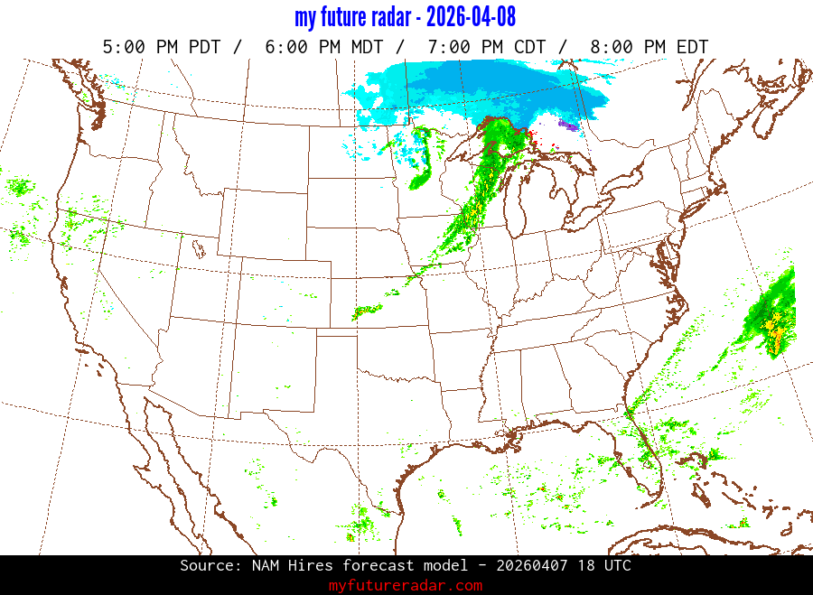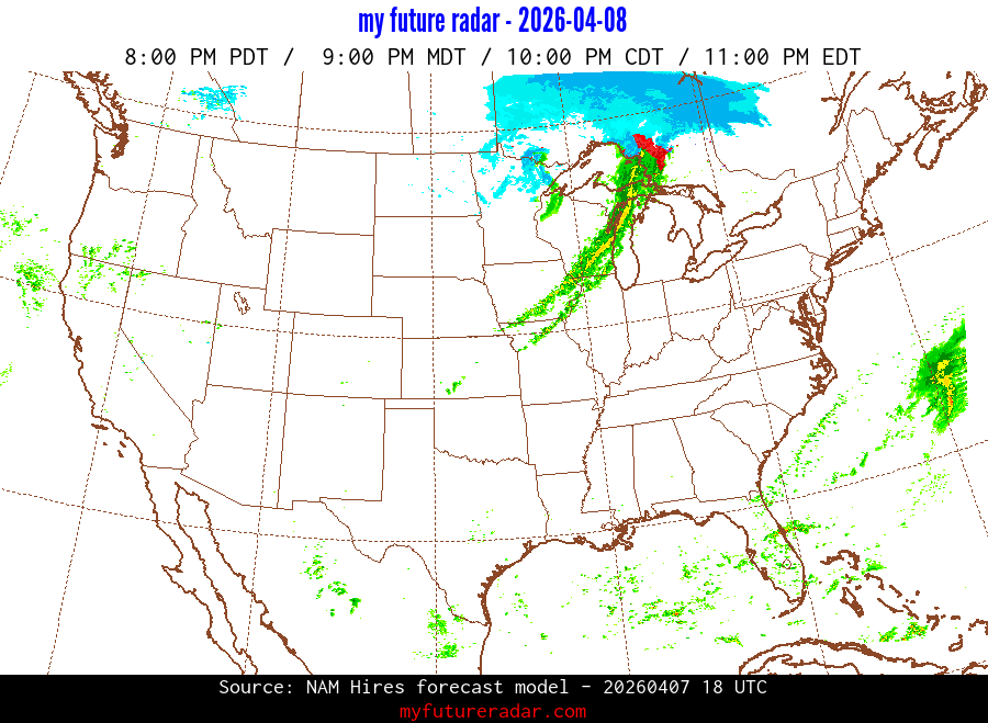 My Future Radar uses data from the Rapid Refresh and the NAM forecast models to provide simulated future radar imagery.
