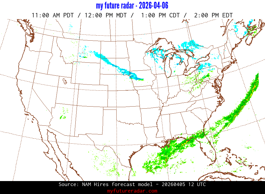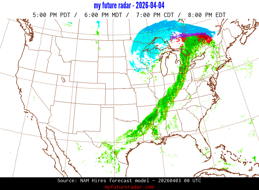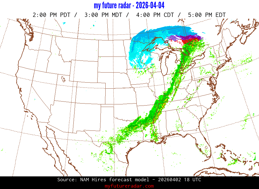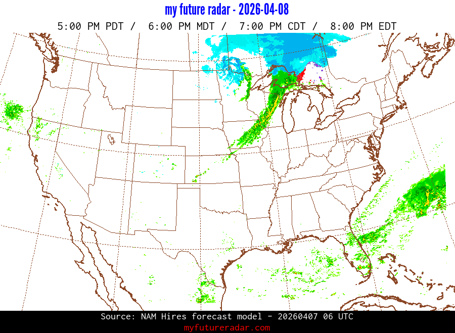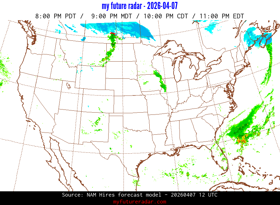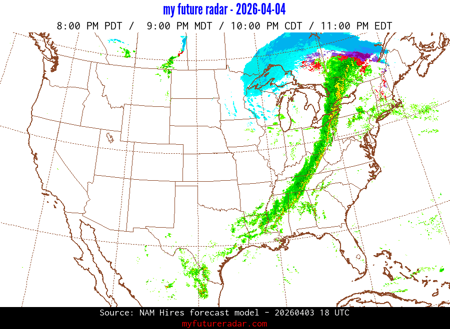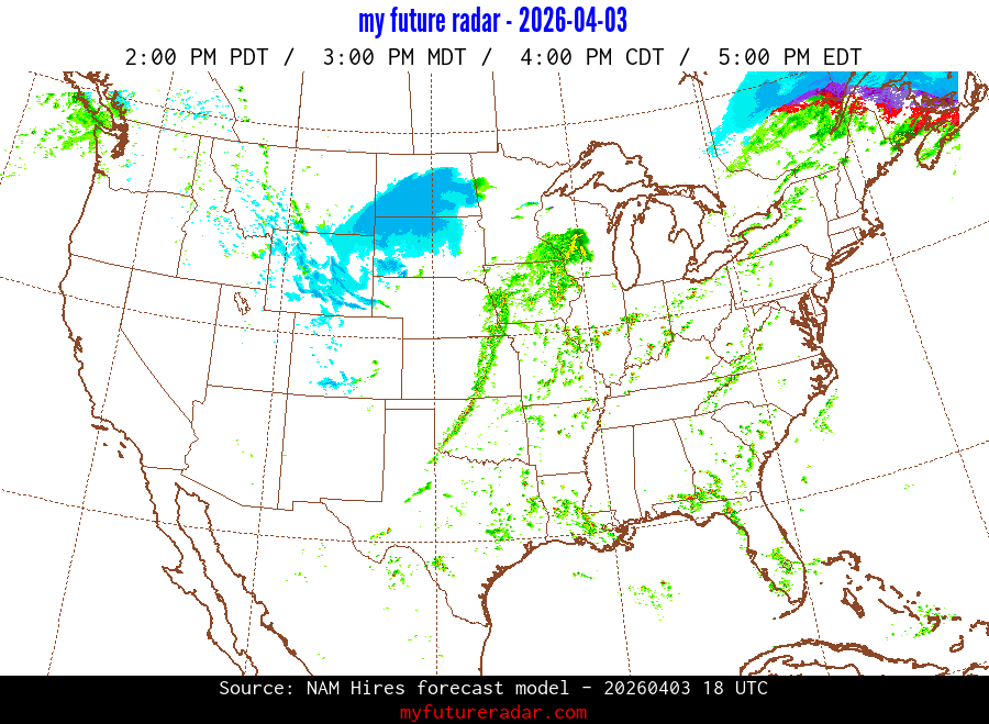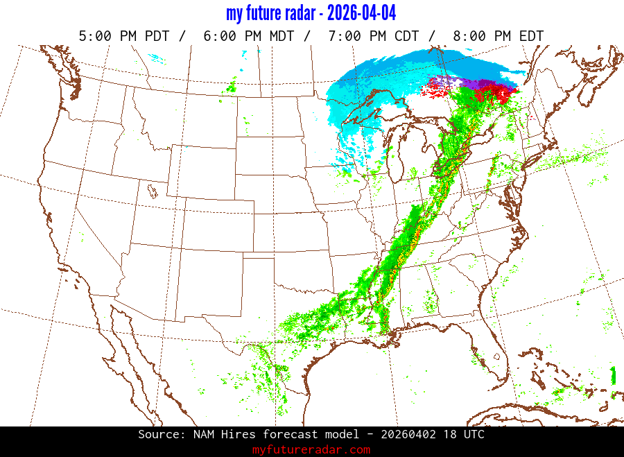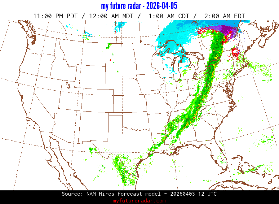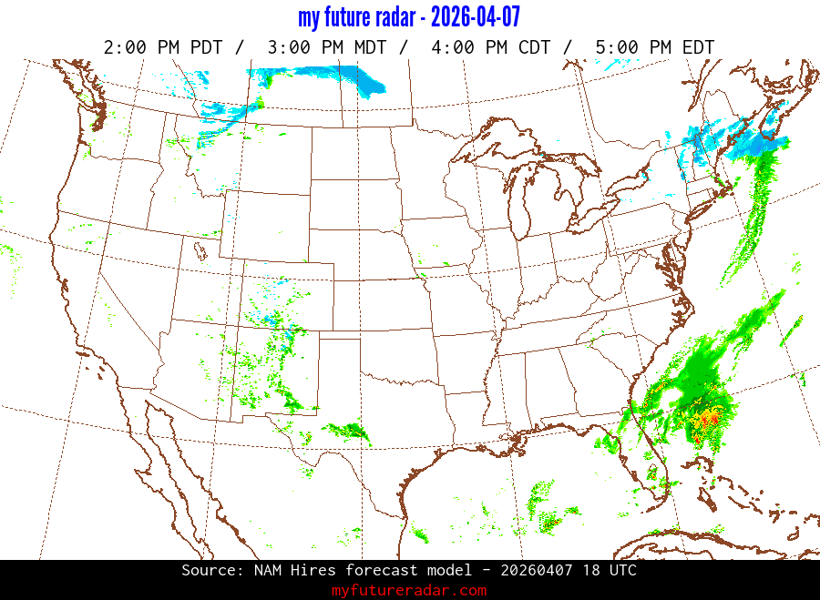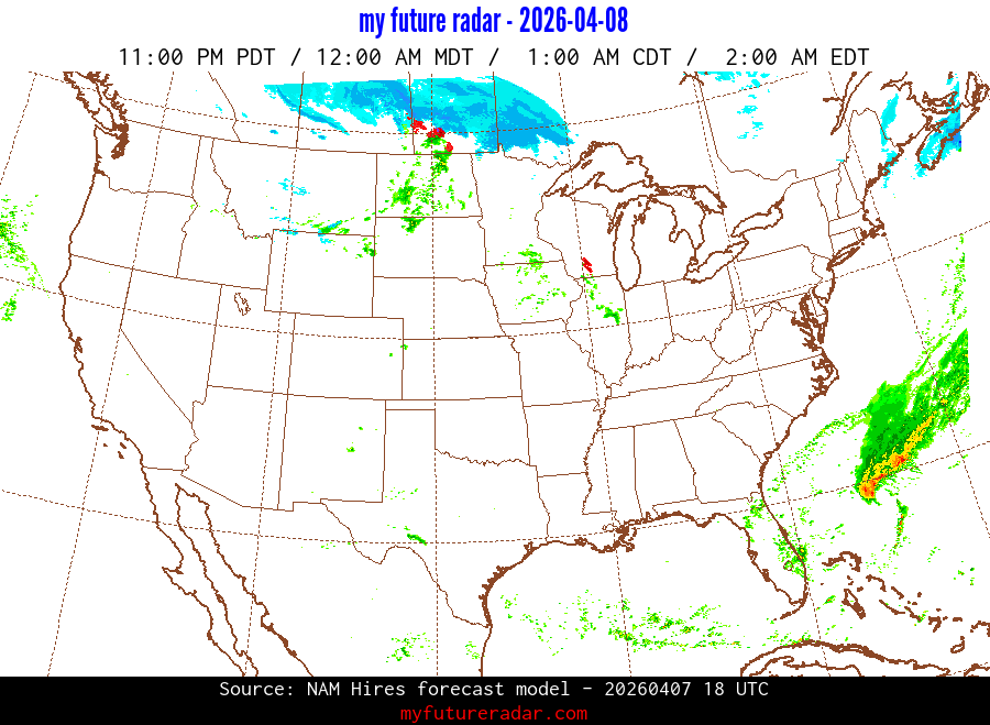 My Future Radar uses data from the Rapid Refresh and the NAM forecast models to provide simulated future radar imagery.