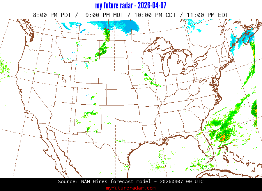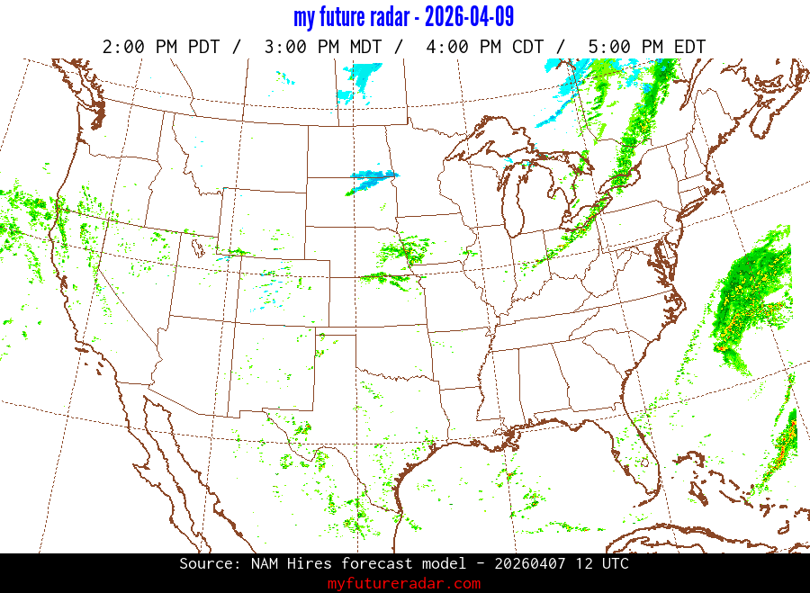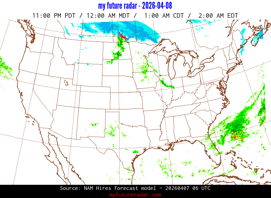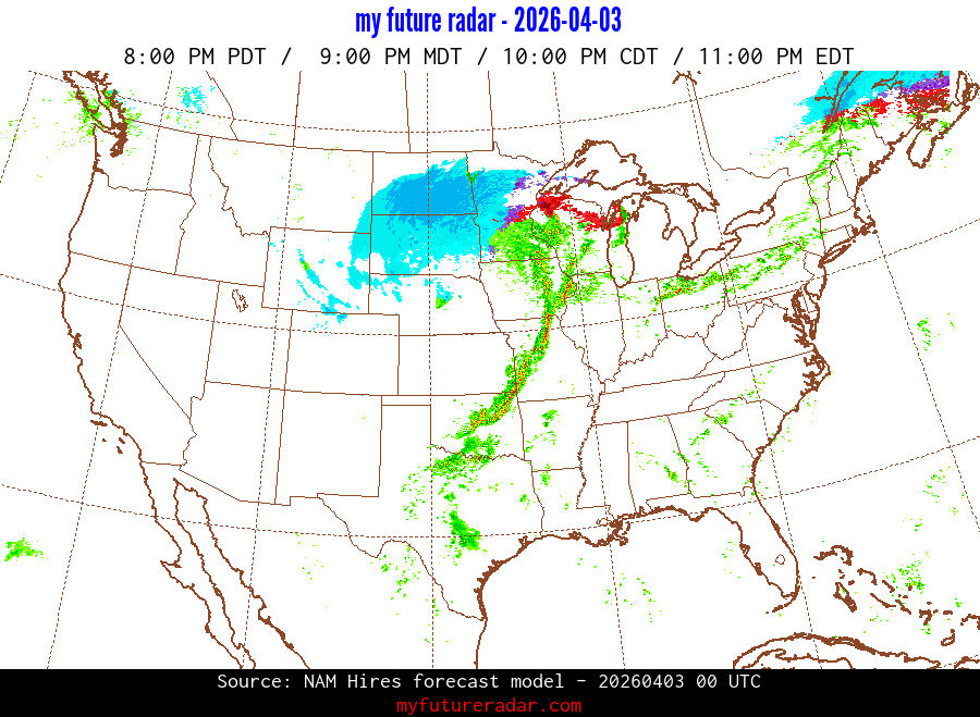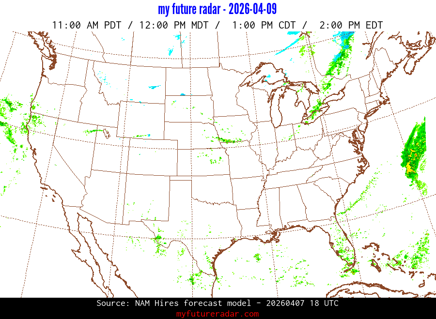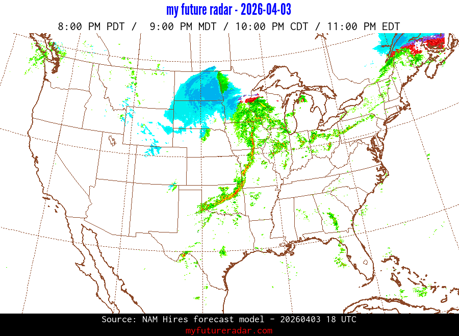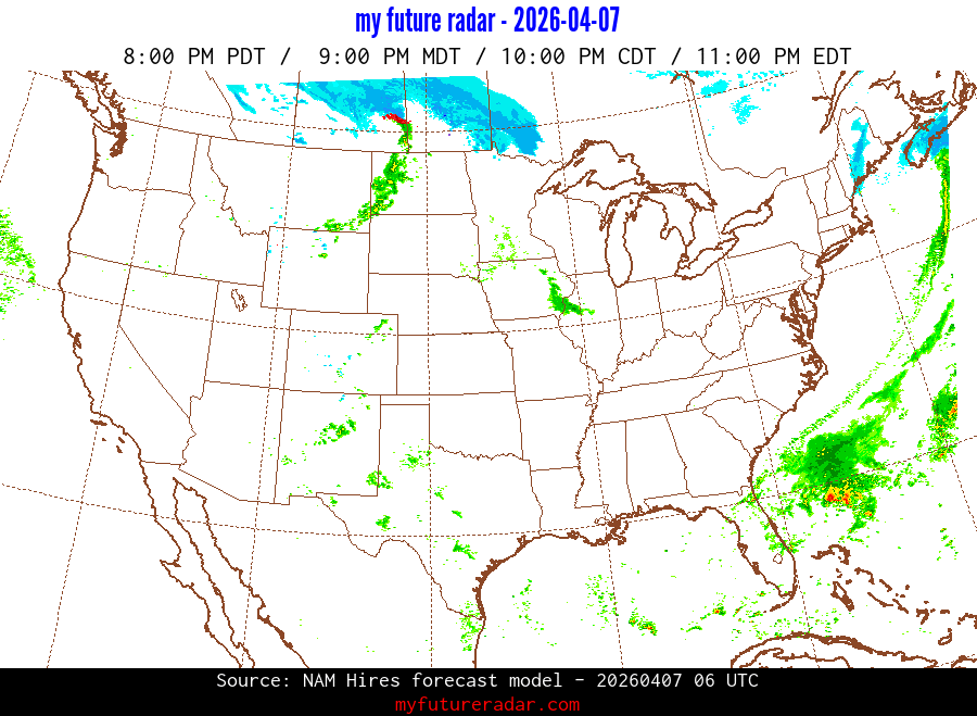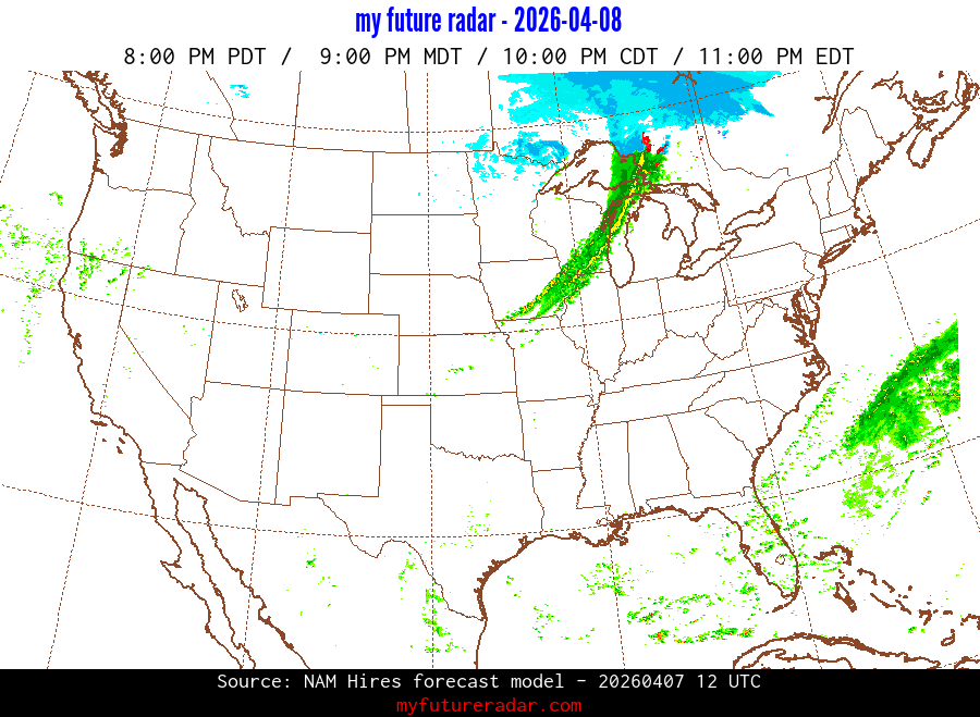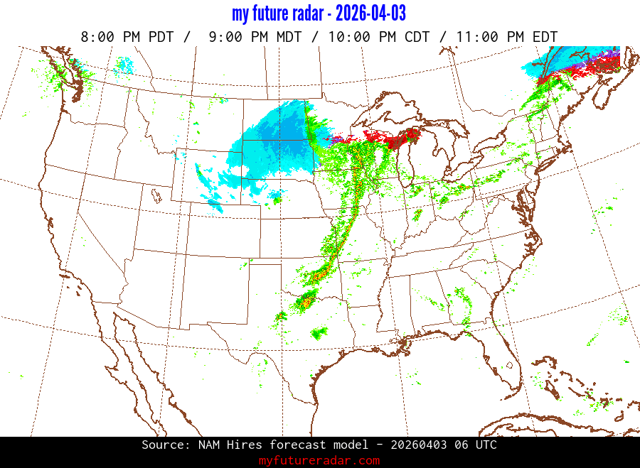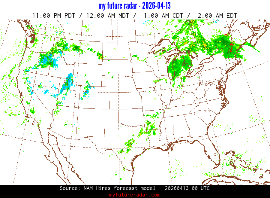 My Future Radar uses data from the Rapid Refresh and the NAM forecast models to provide simulated future radar imagery.