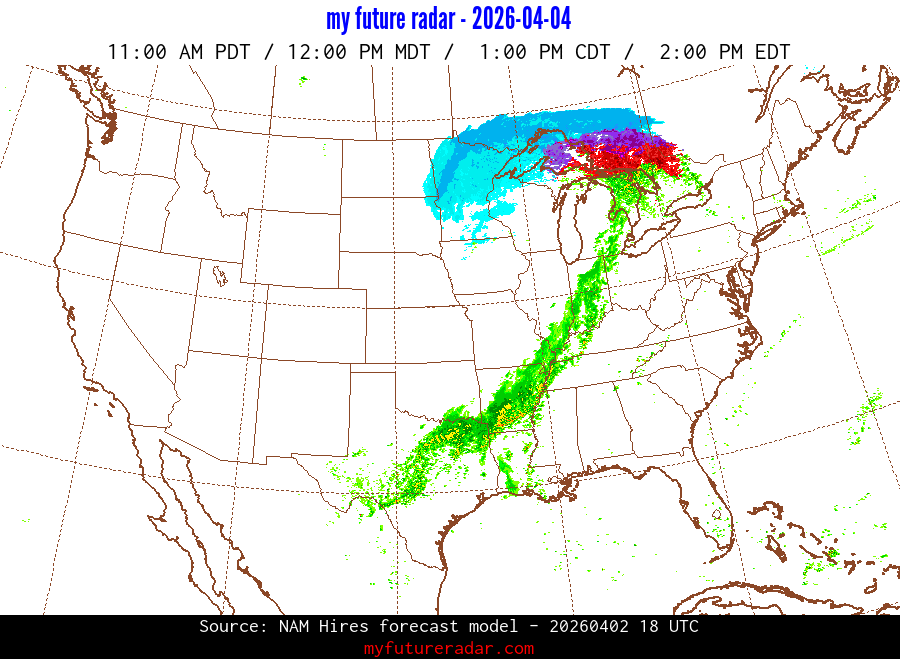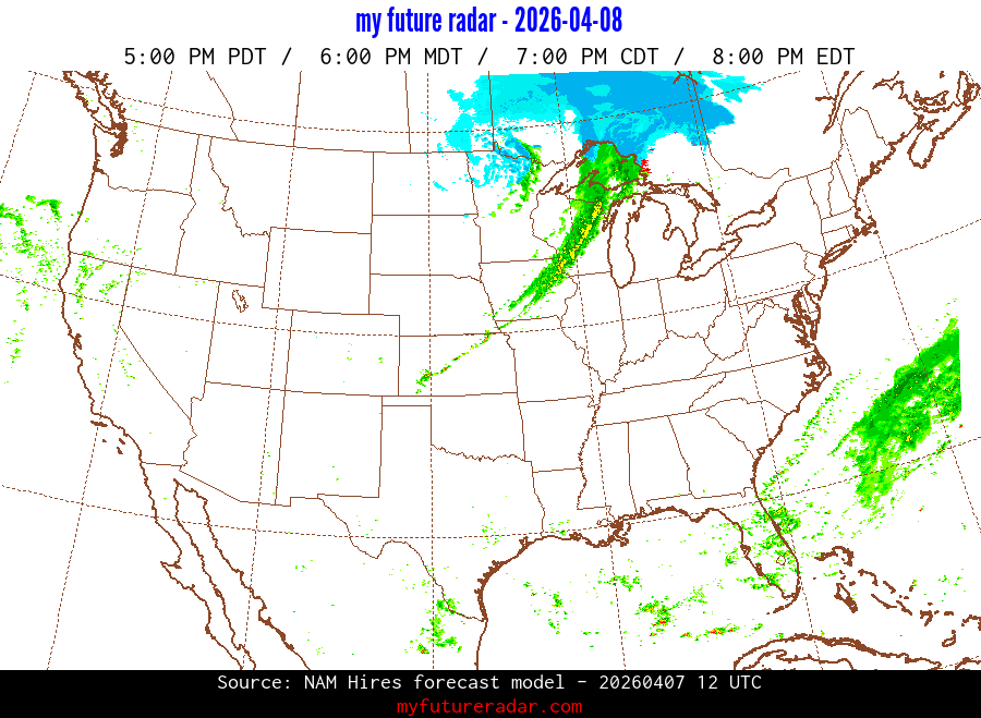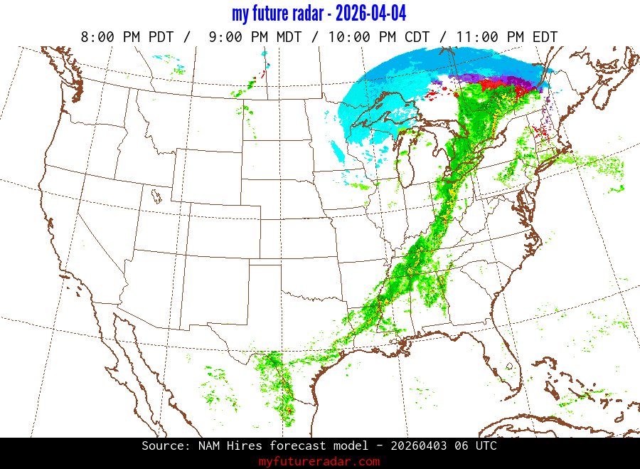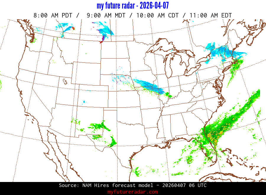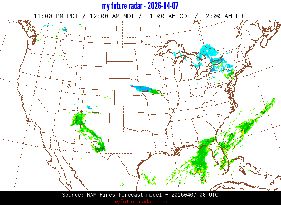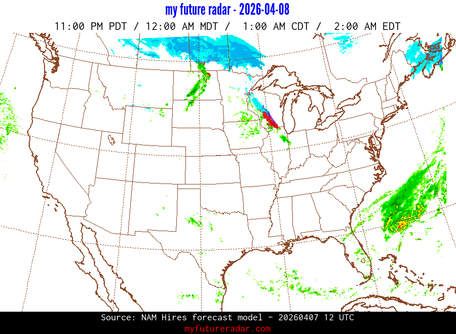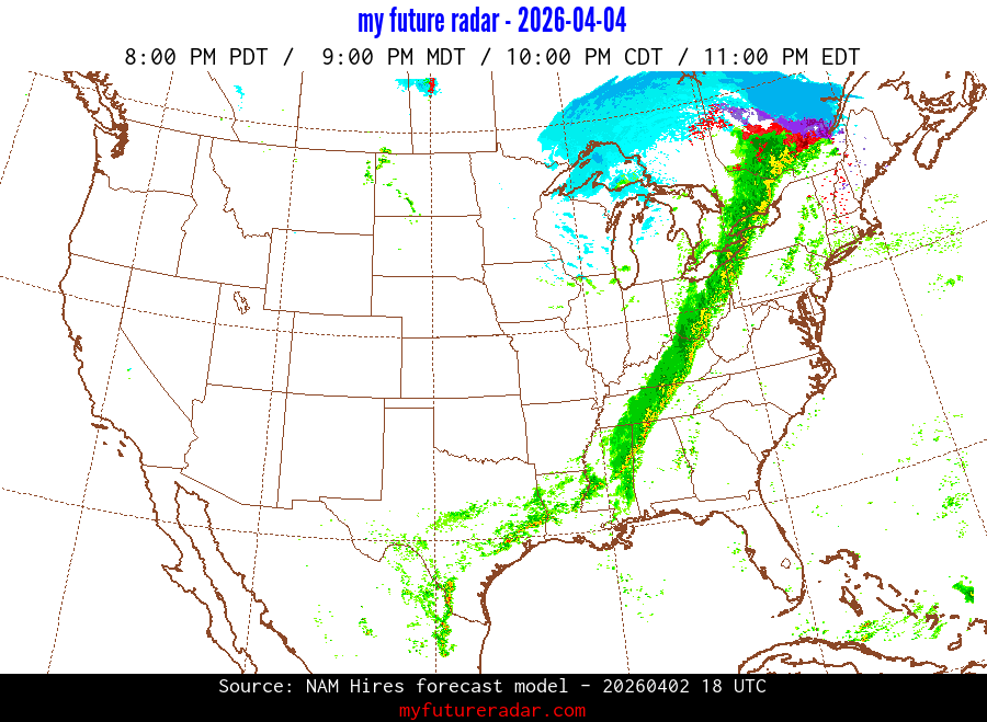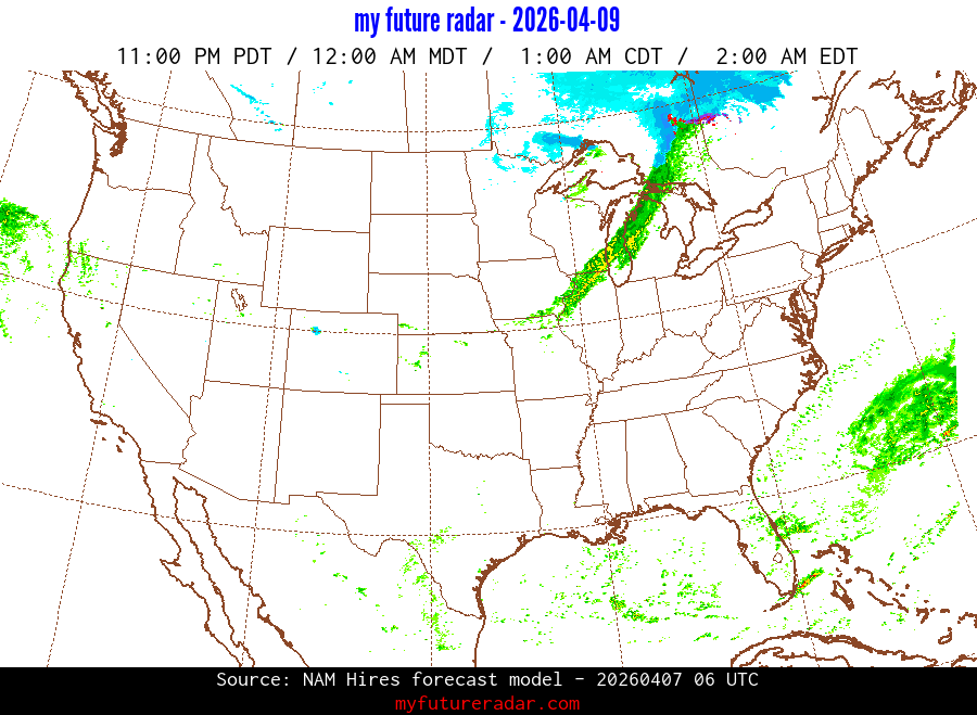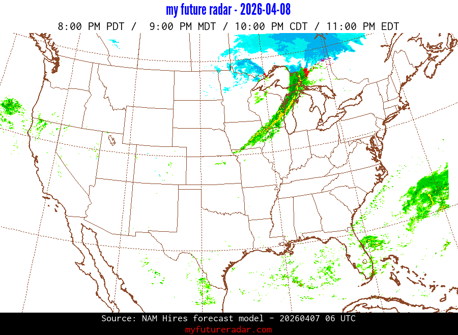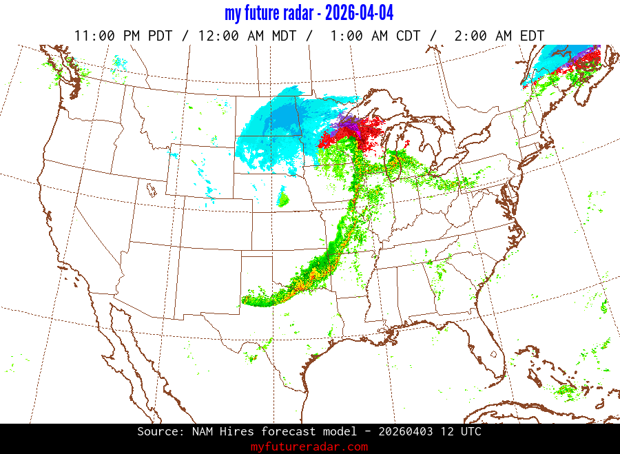 My Future Radar uses data from the Rapid Refresh and the NAM forecast models to provide simulated future radar imagery.