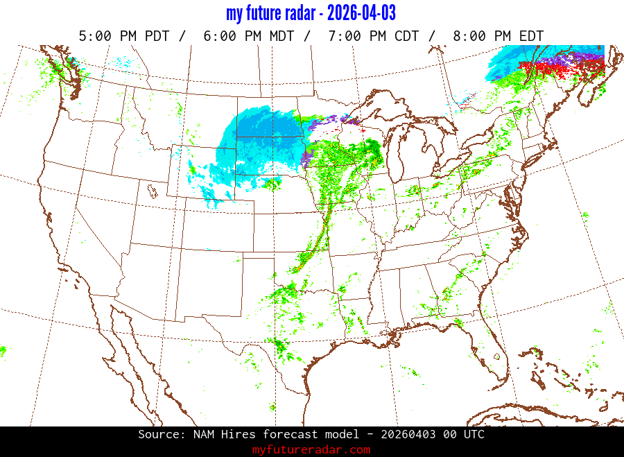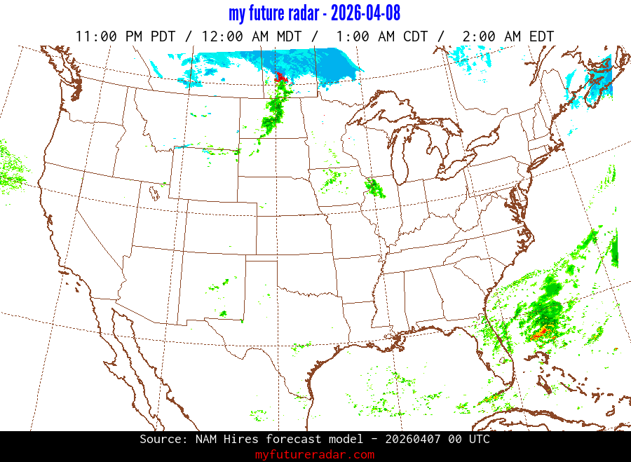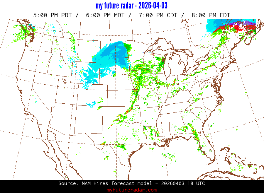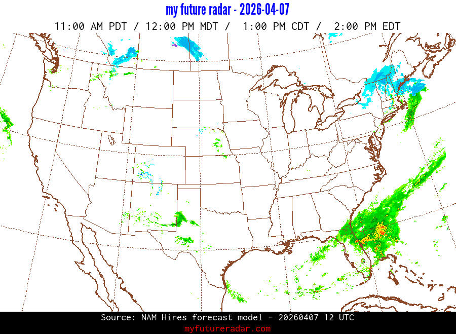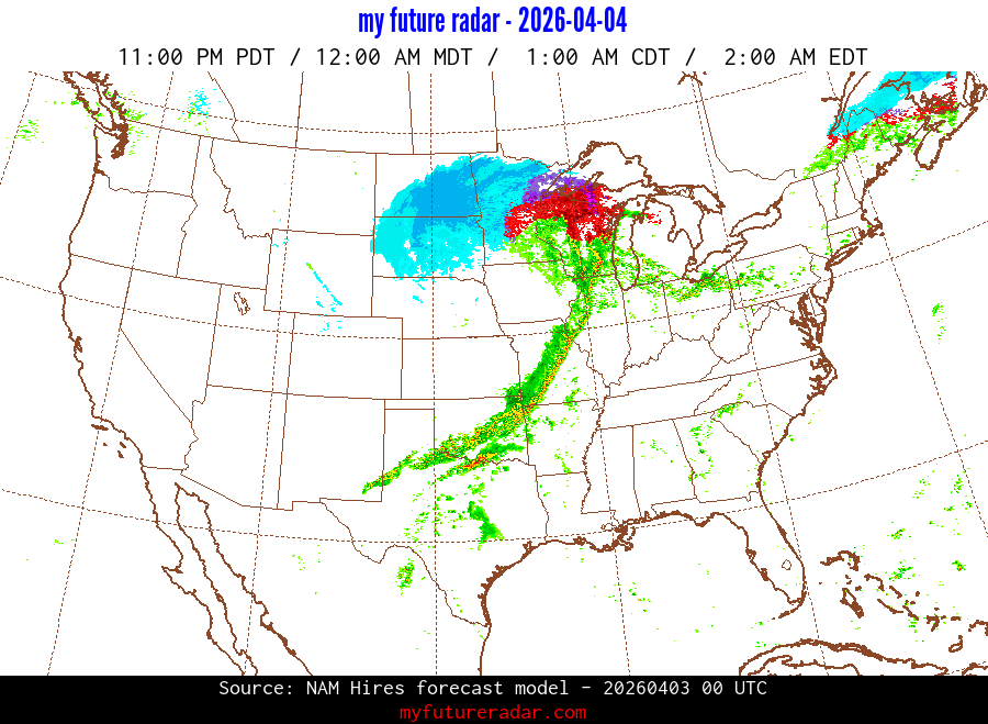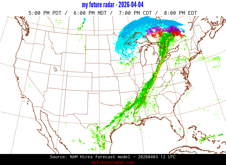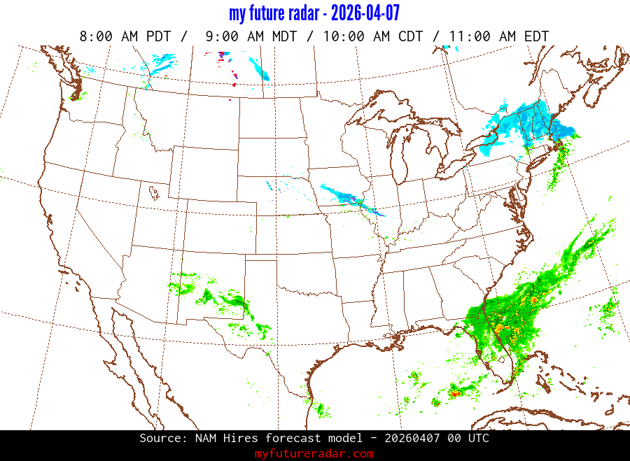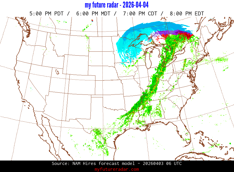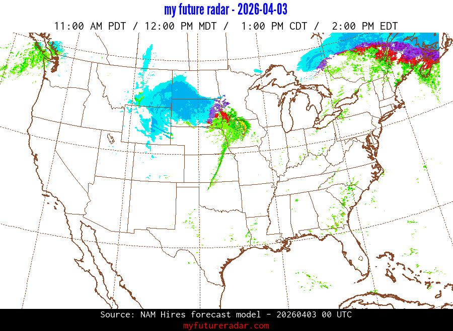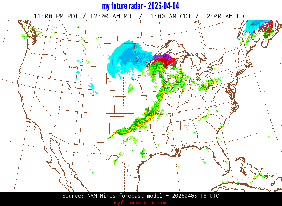 My Future Radar uses data from the Rapid Refresh and the NAM forecast models to provide simulated future radar imagery.