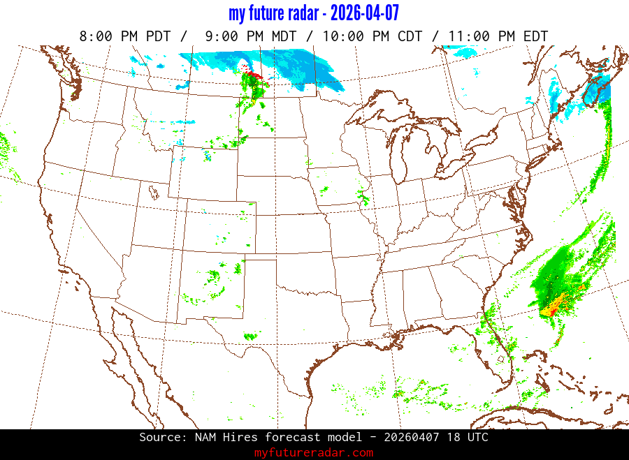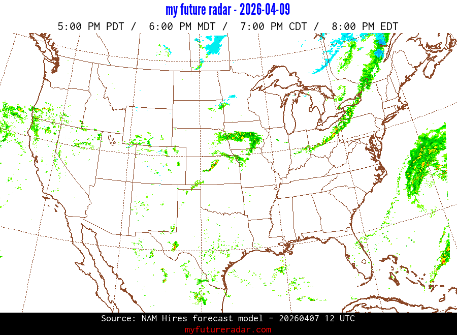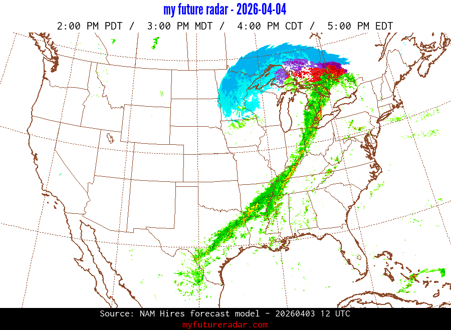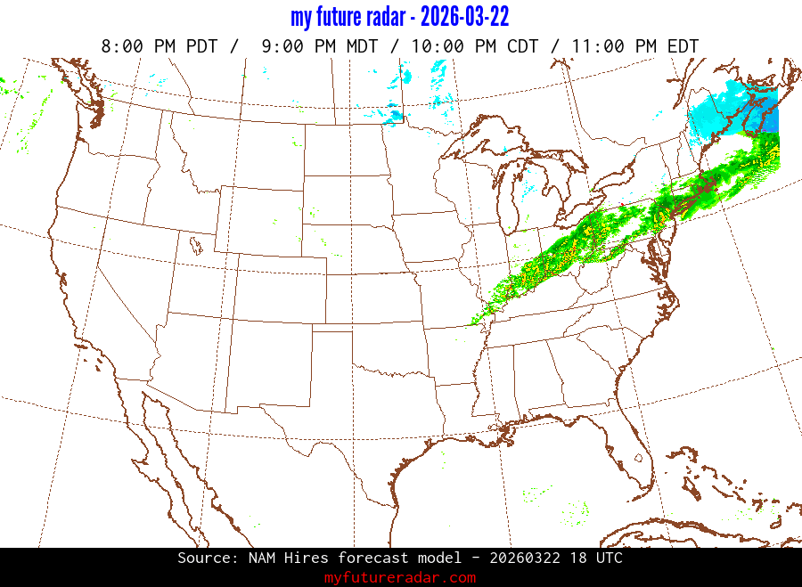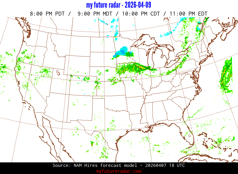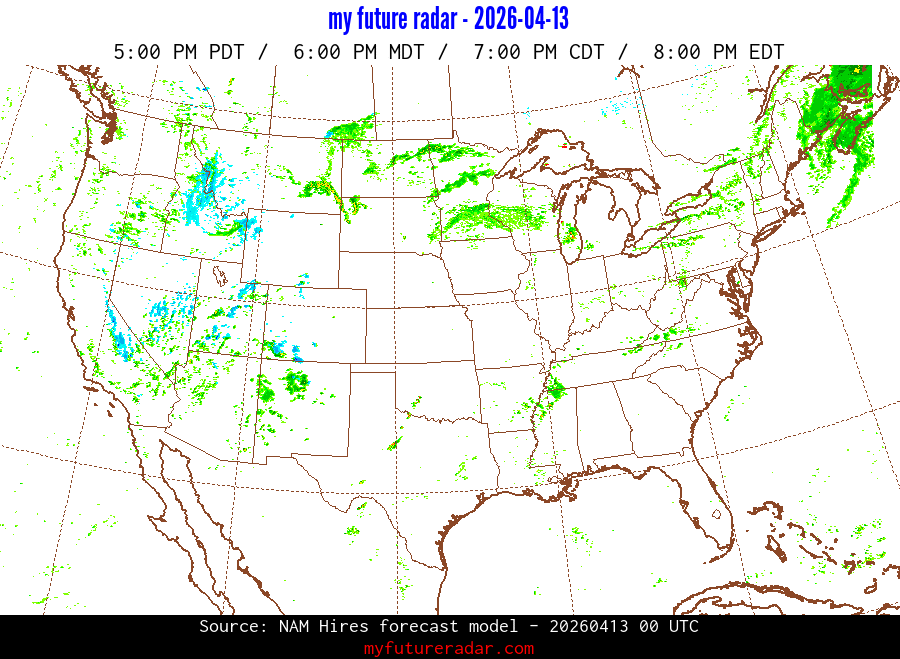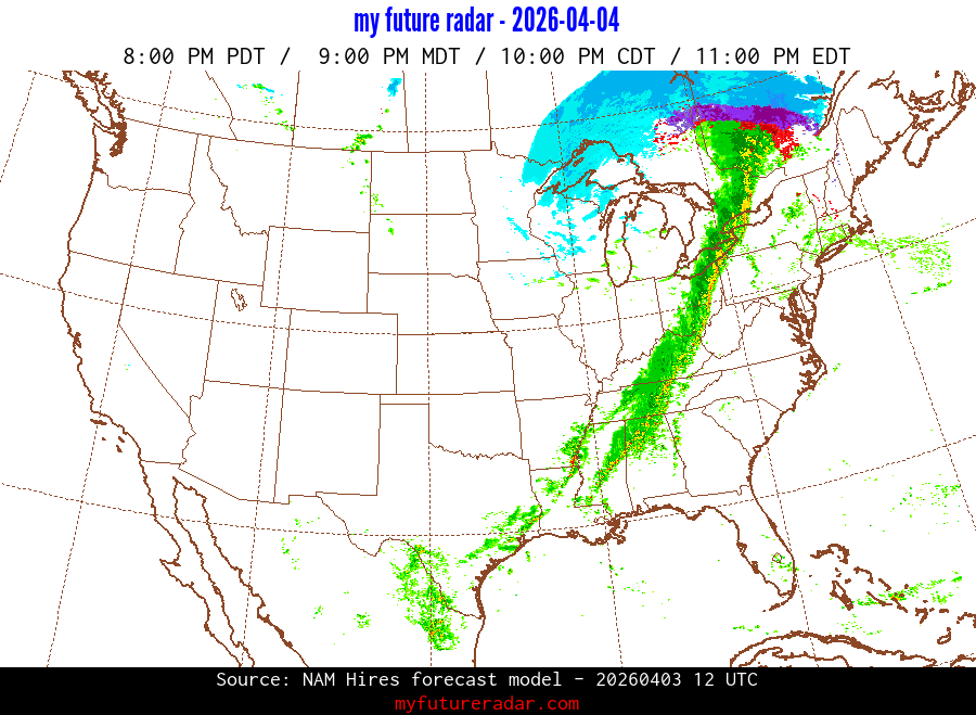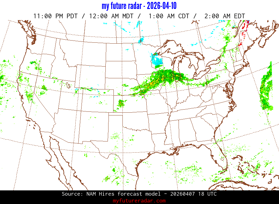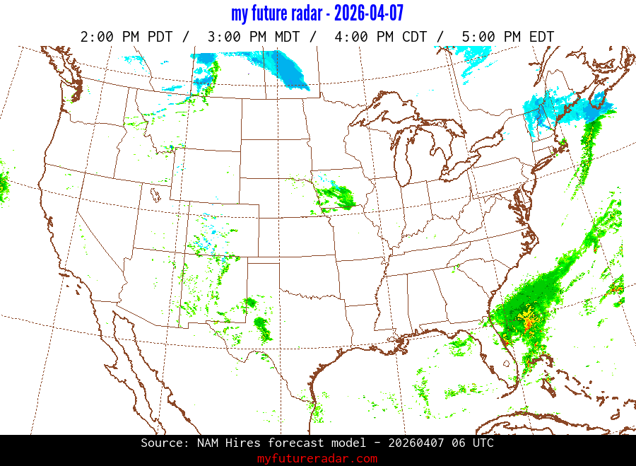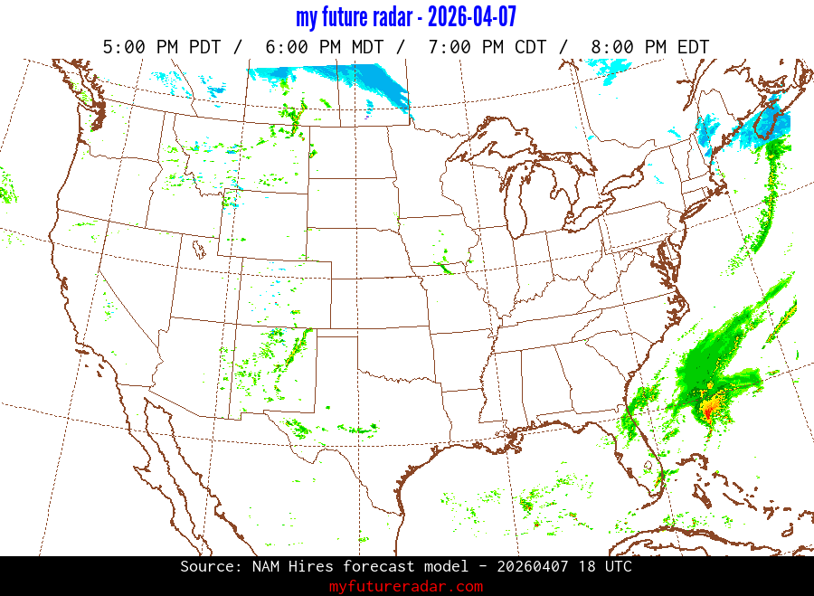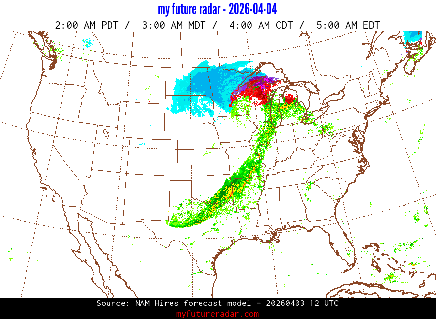 My Future Radar uses data from the Rapid Refresh and the NAM forecast models to provide simulated future radar imagery.