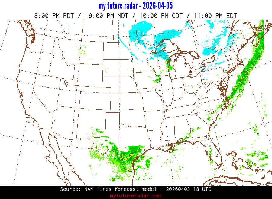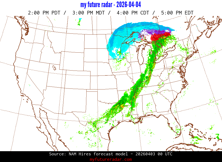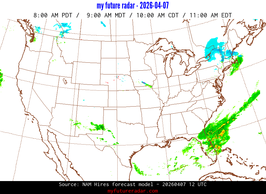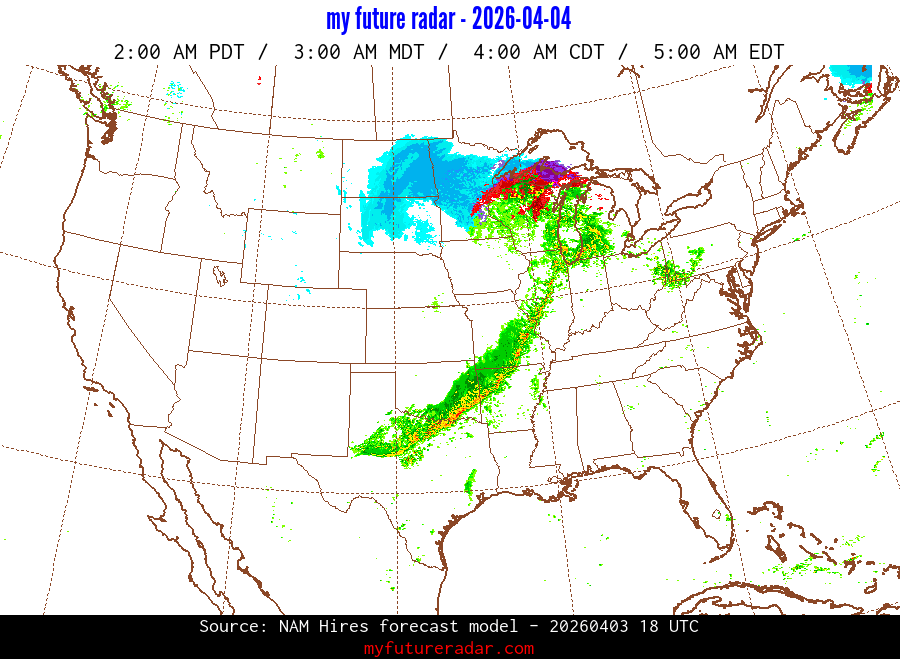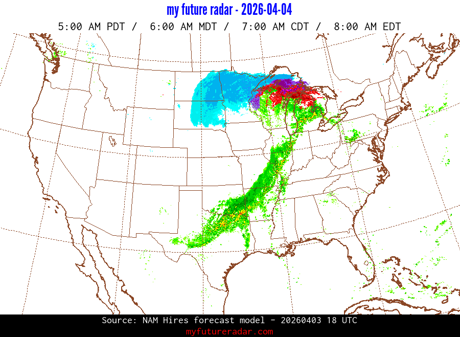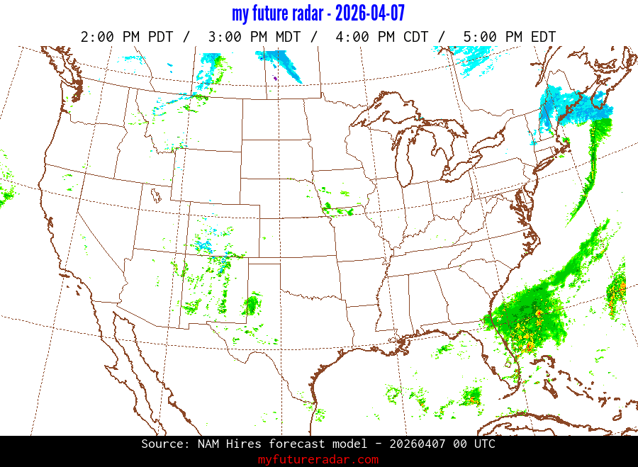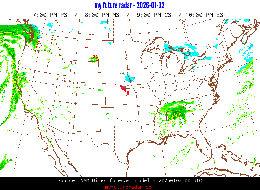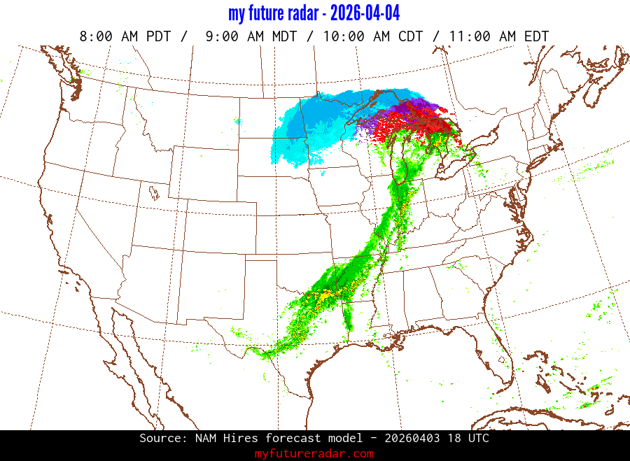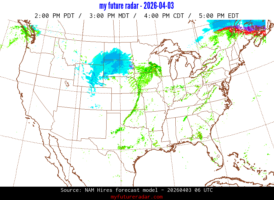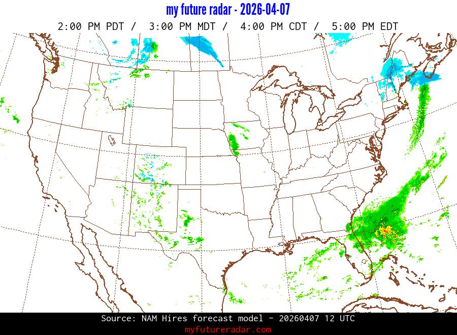 My Future Radar uses data from the Rapid Refresh and the NAM forecast models to provide simulated future radar imagery.