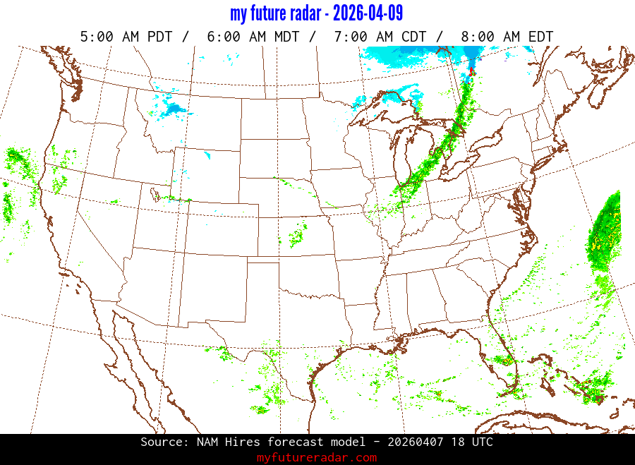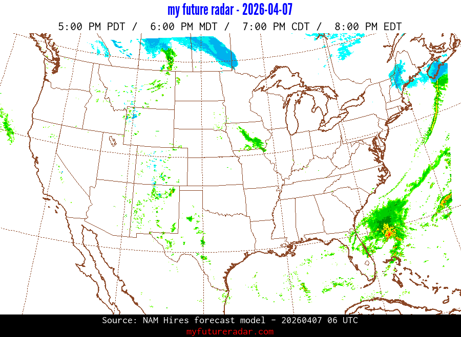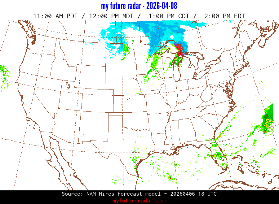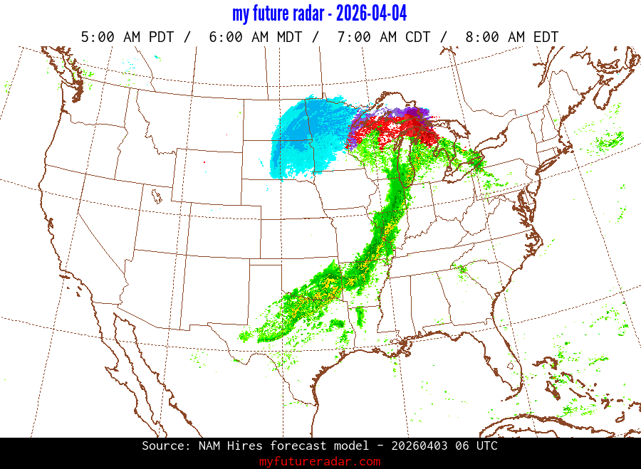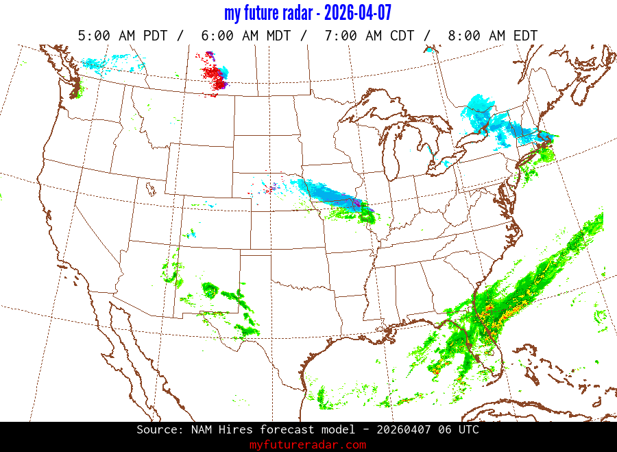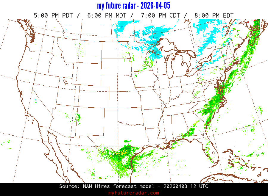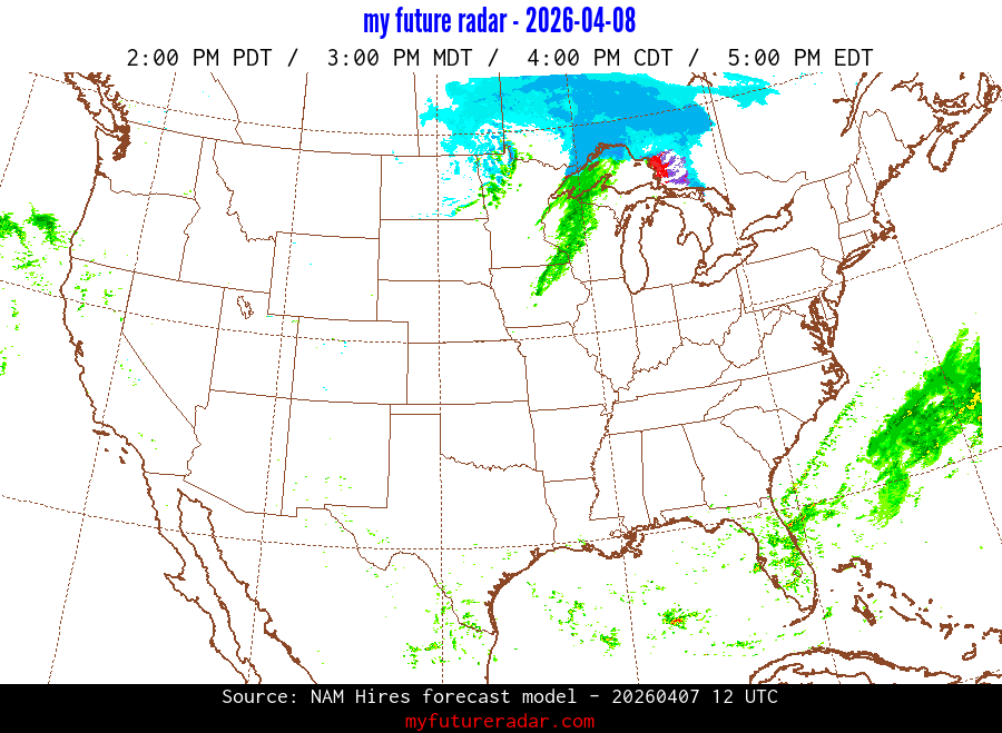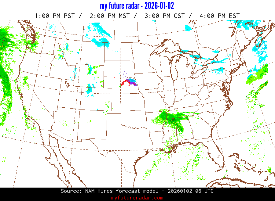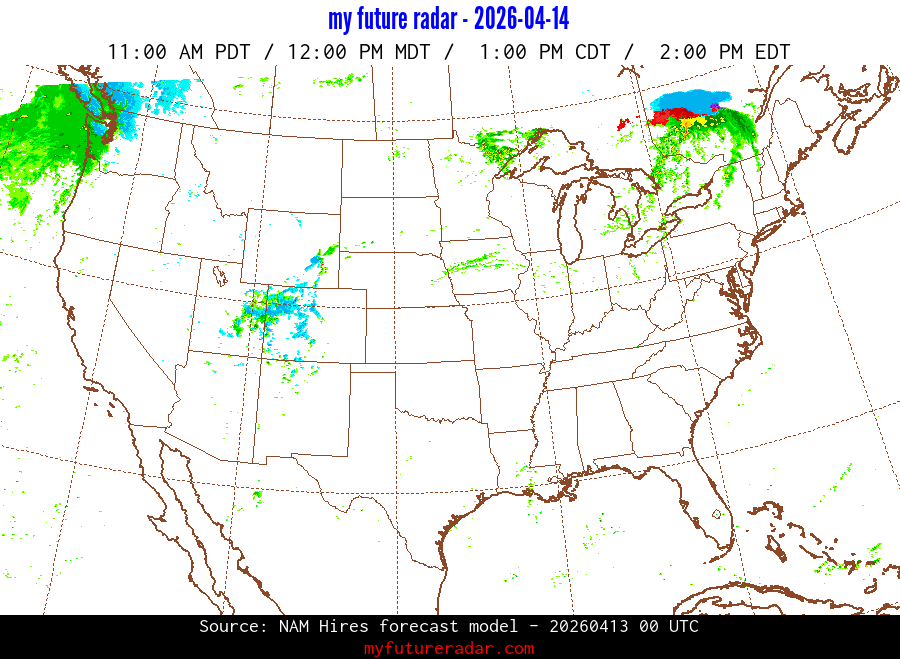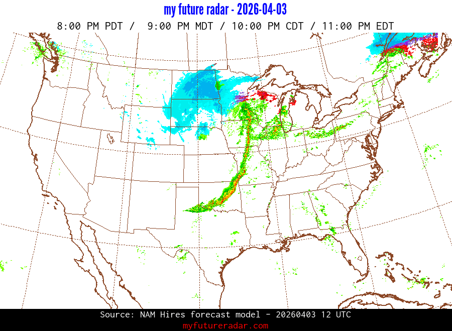 My Future Radar uses data from the Rapid Refresh and the NAM forecast models to provide simulated future radar imagery.