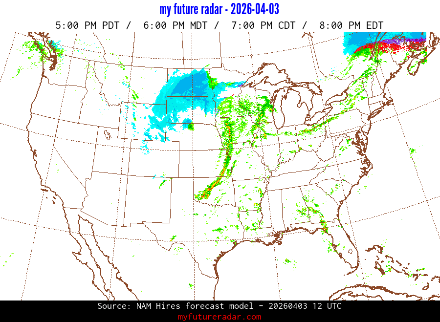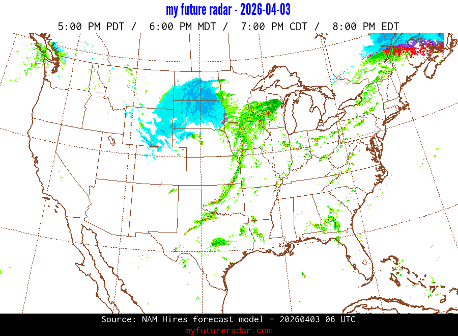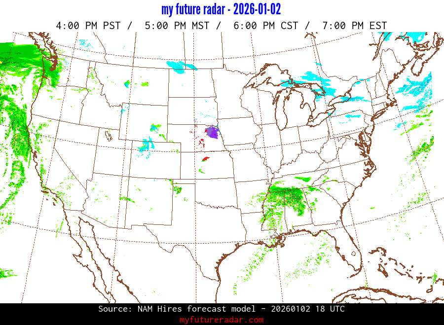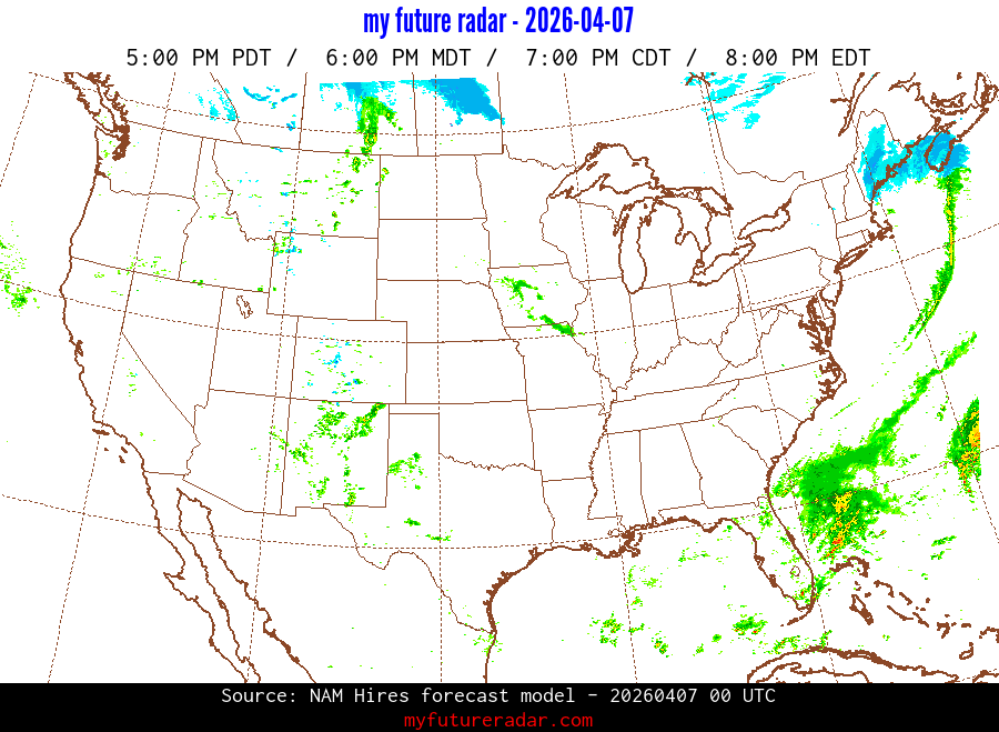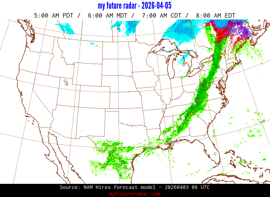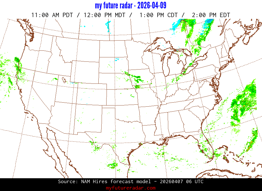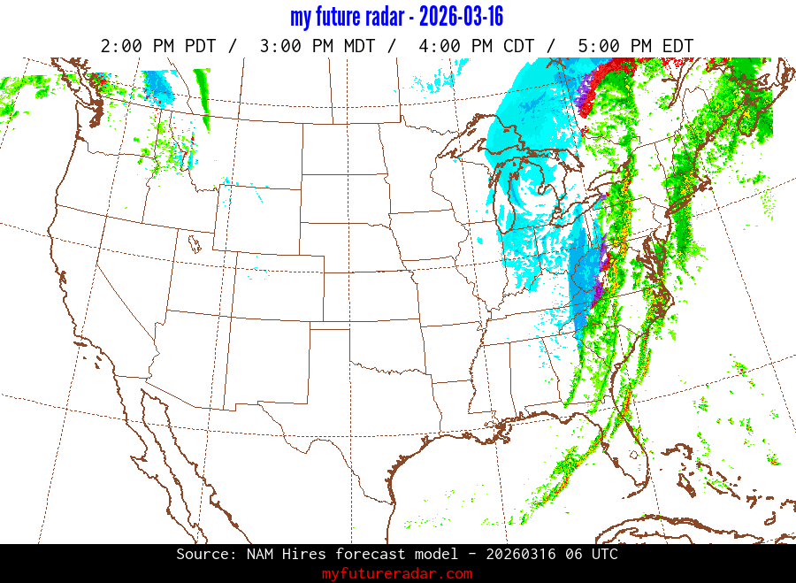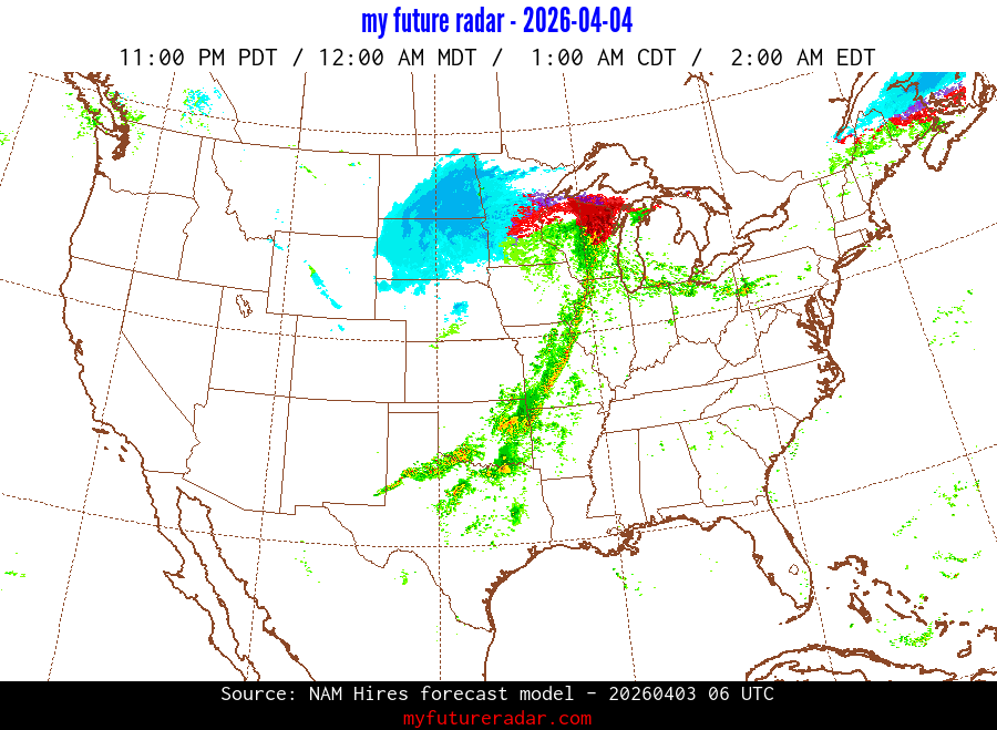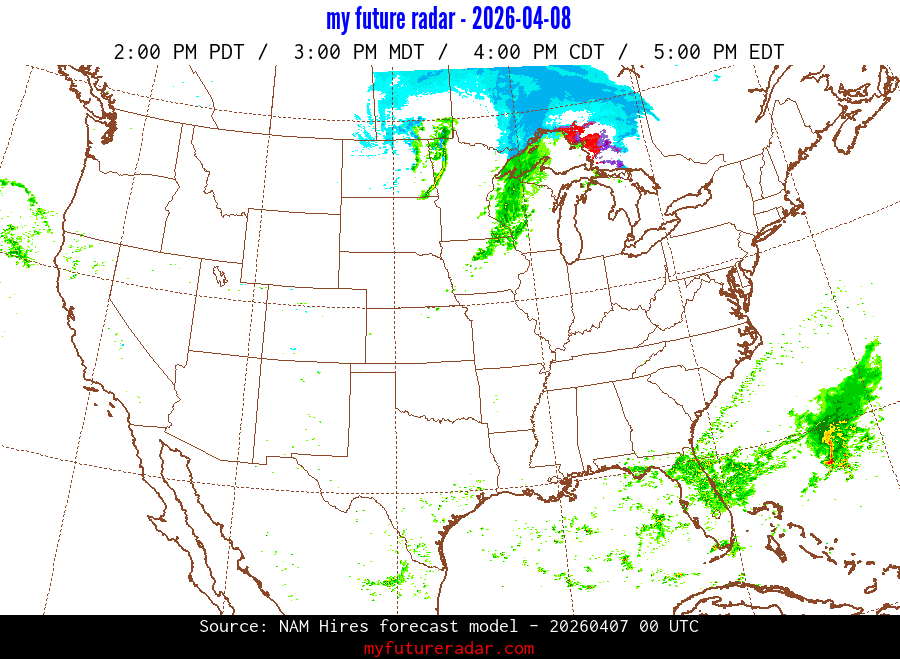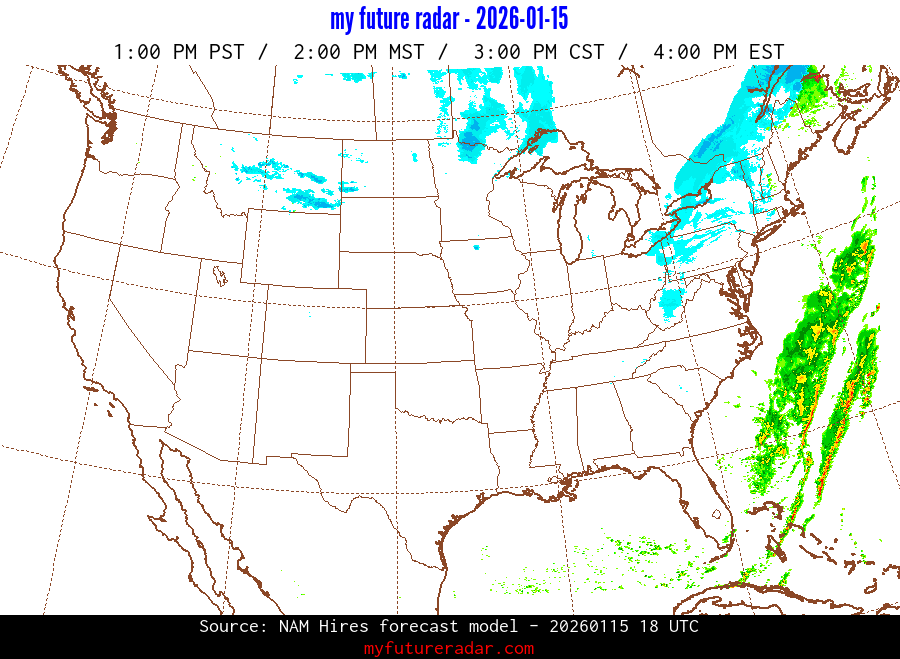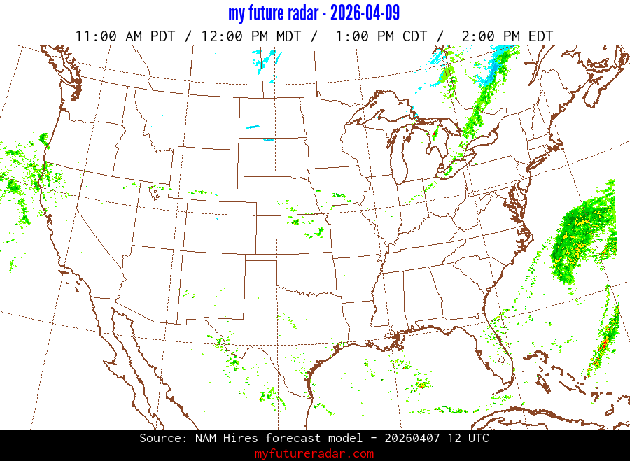 My Future Radar uses data from the Rapid Refresh and the NAM forecast models to provide simulated future radar imagery.