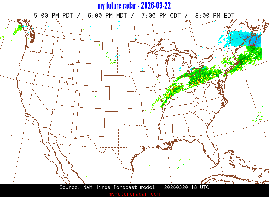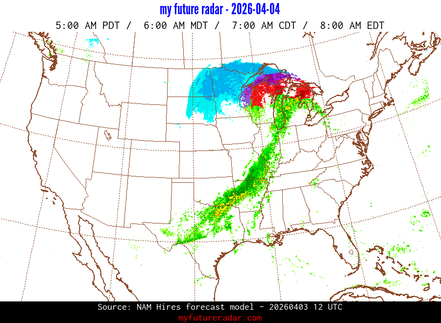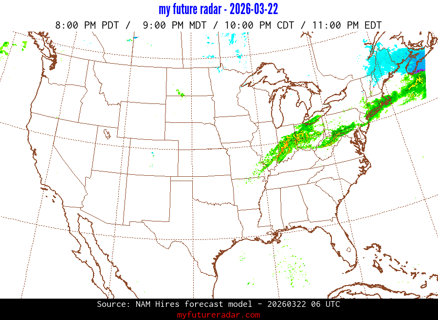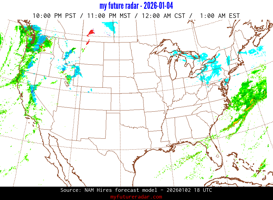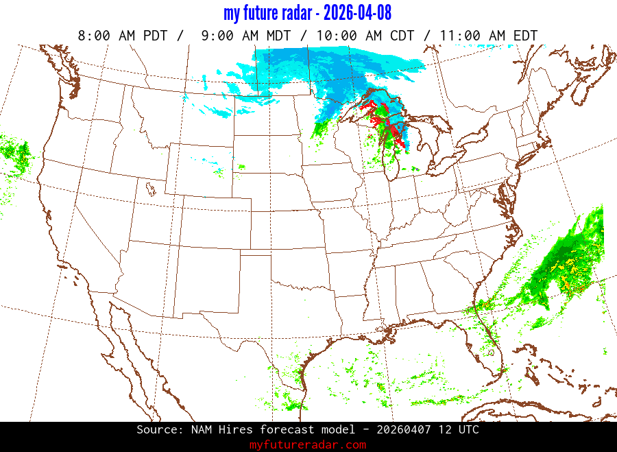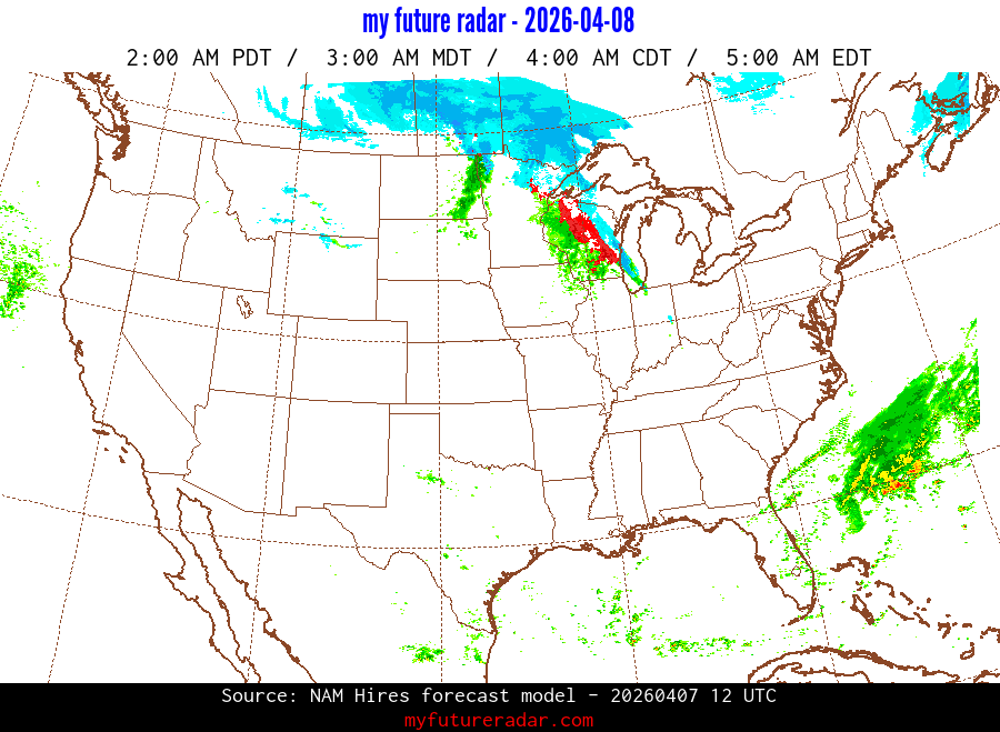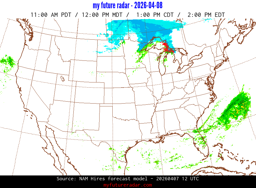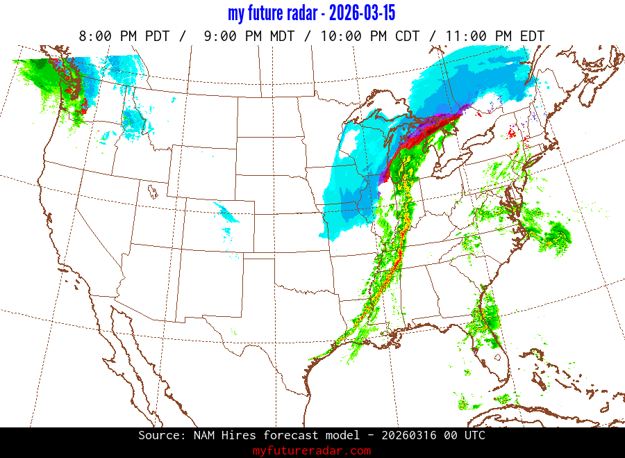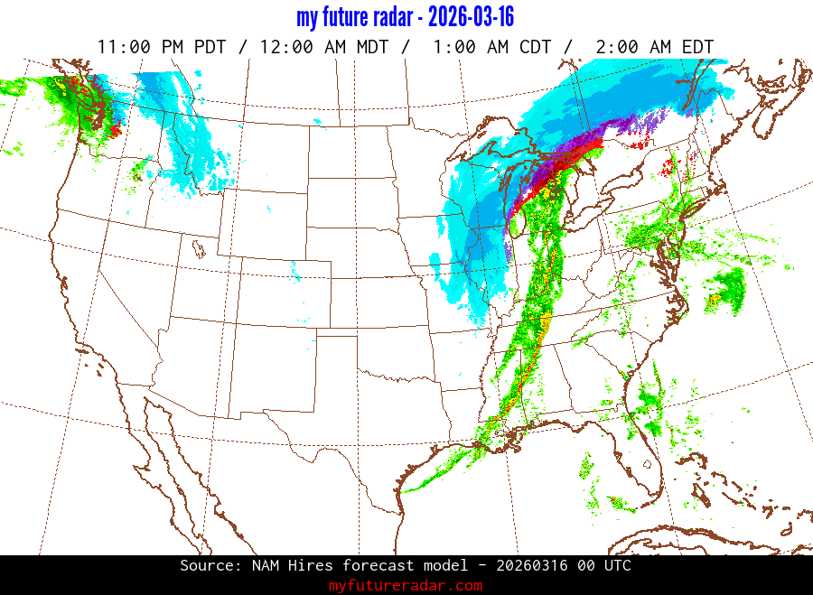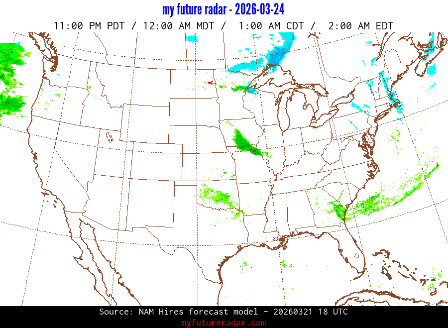 My Future Radar uses data from the Rapid Refresh and the NAM forecast models to provide simulated future radar imagery.