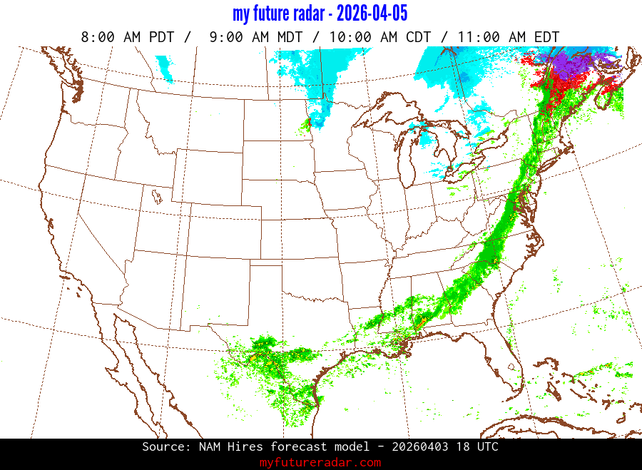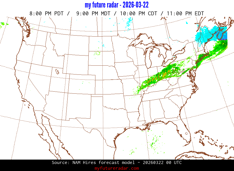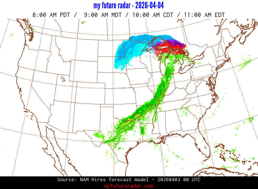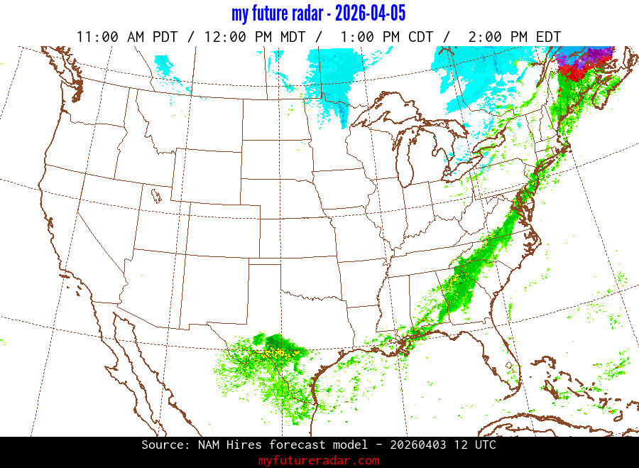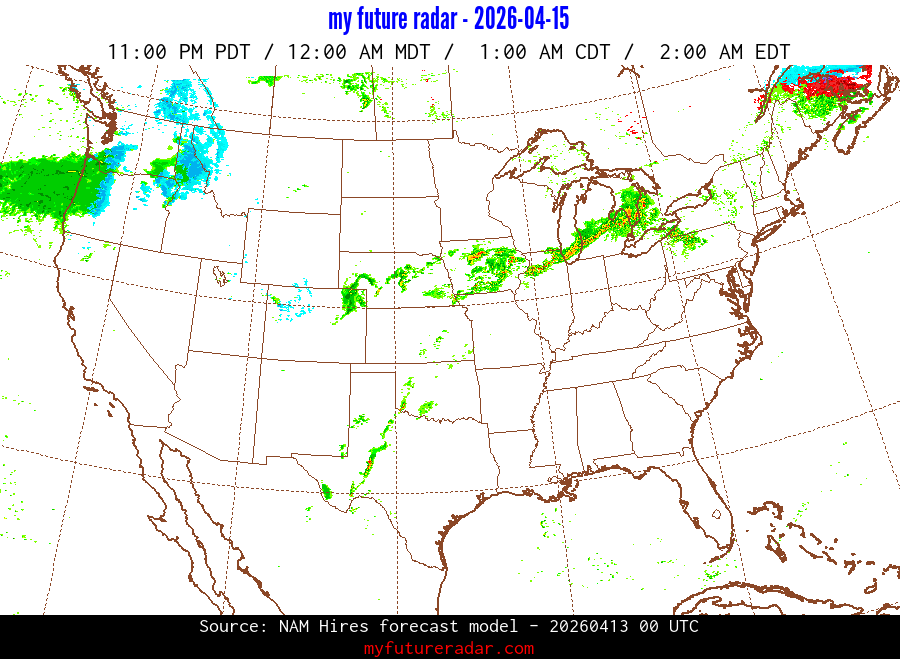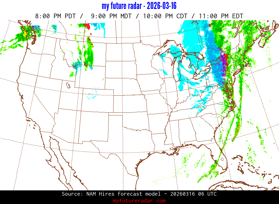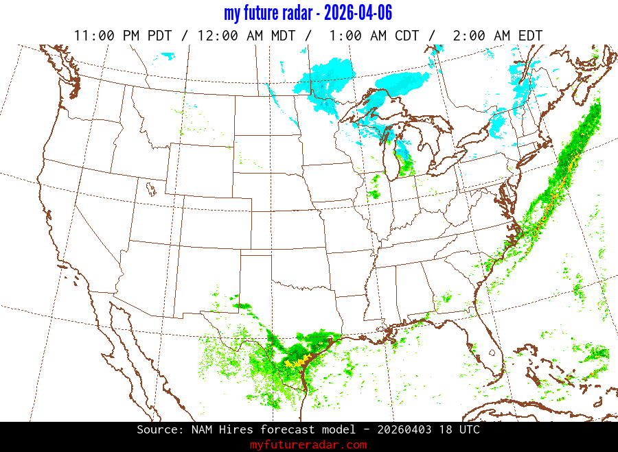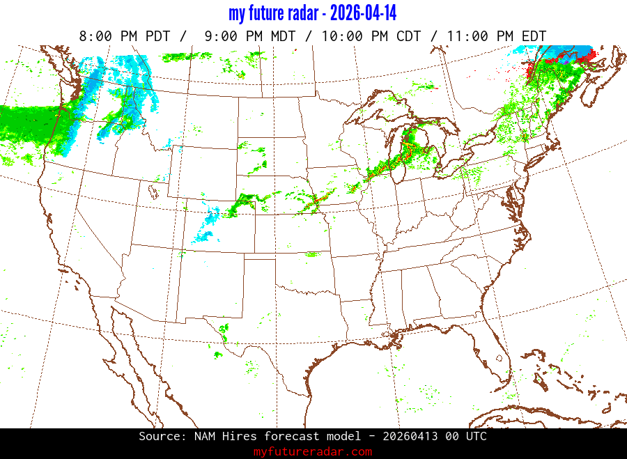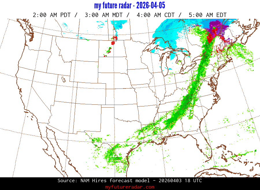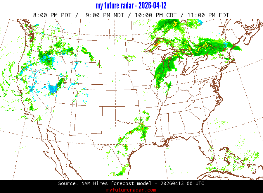 My Future Radar uses data from the Rapid Refresh and the NAM forecast models to provide simulated future radar imagery.