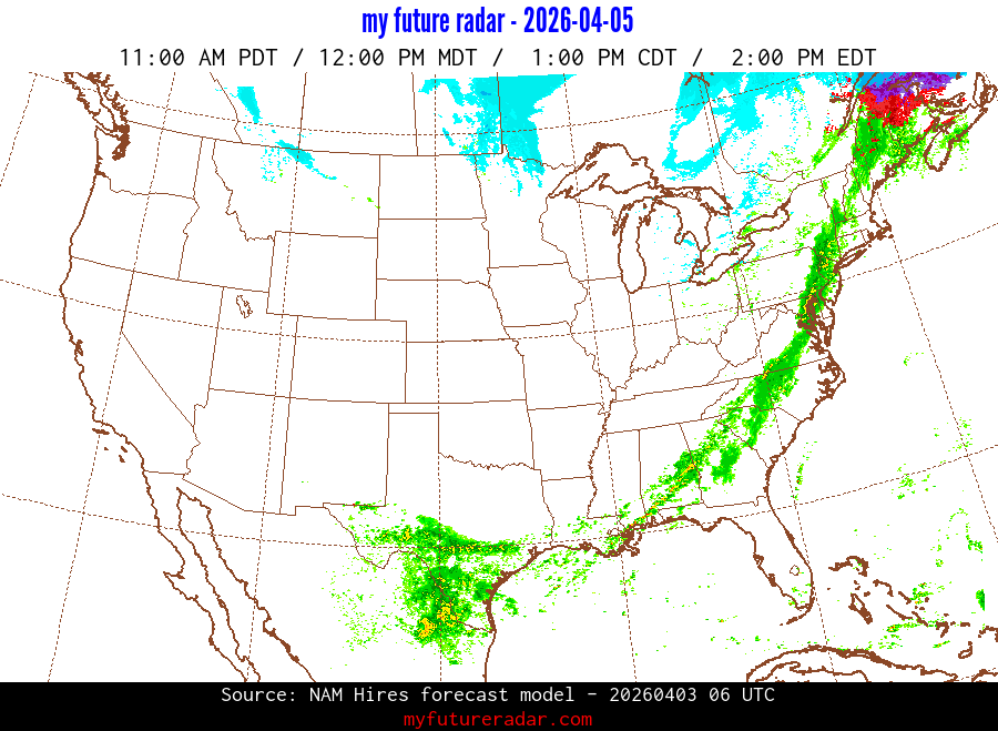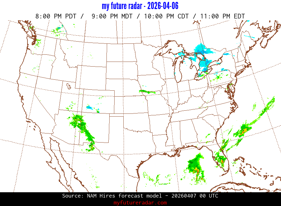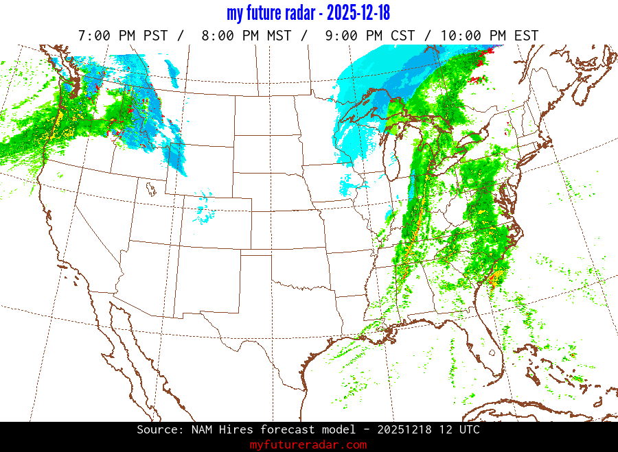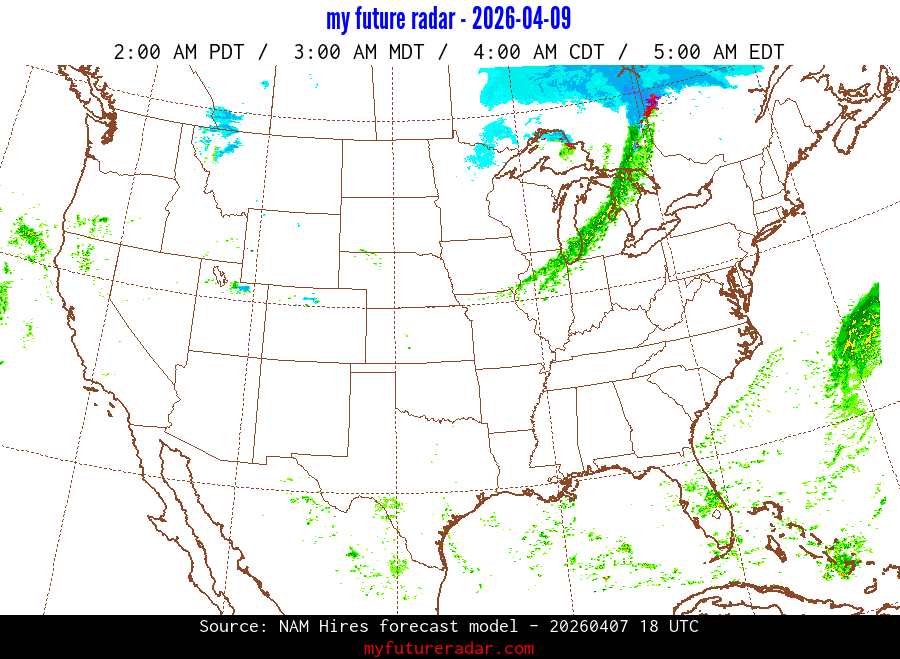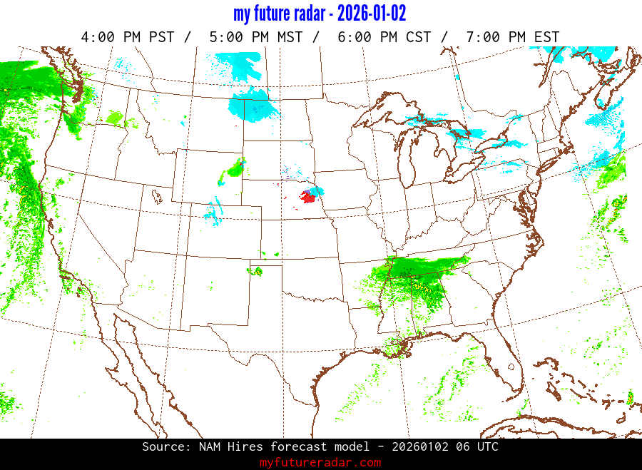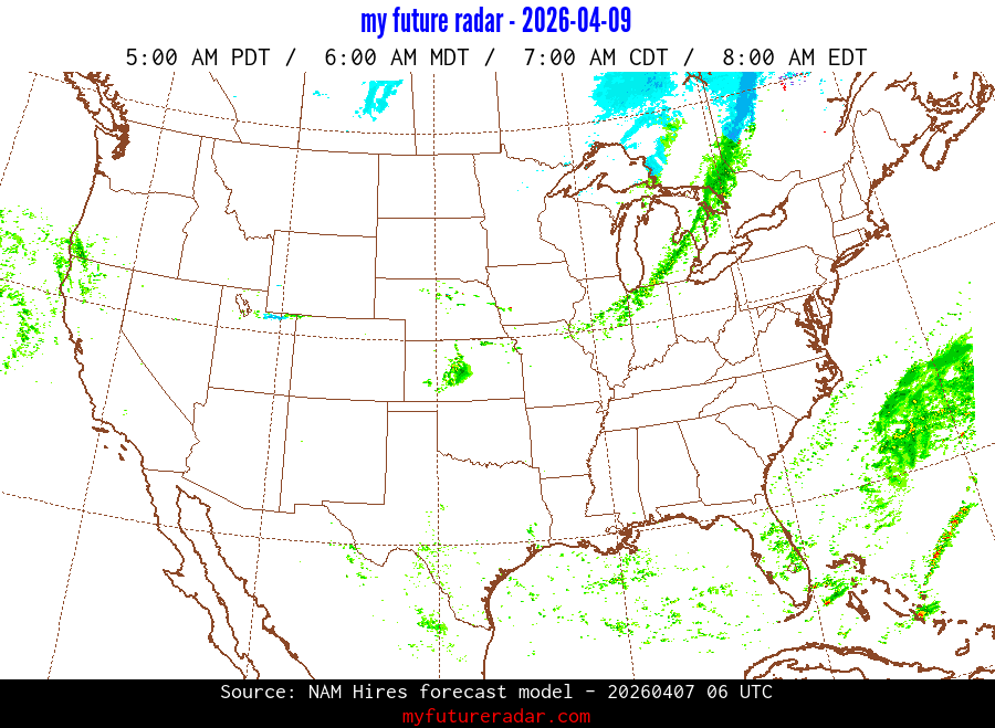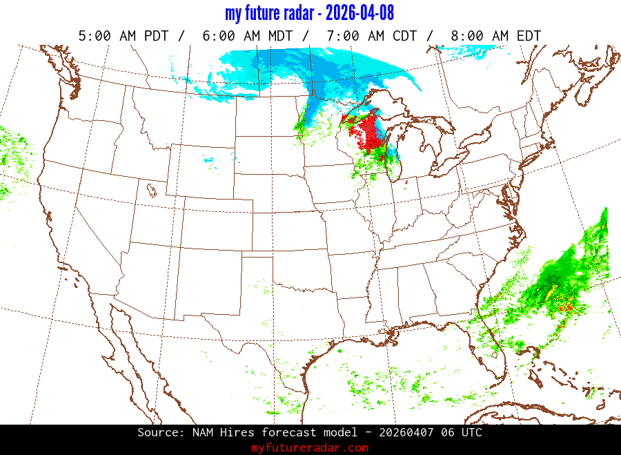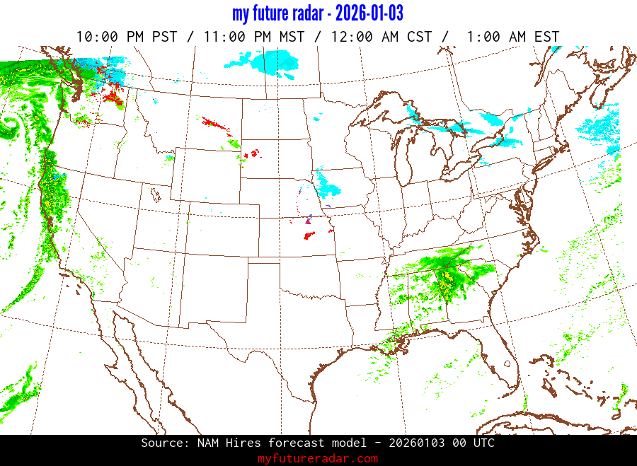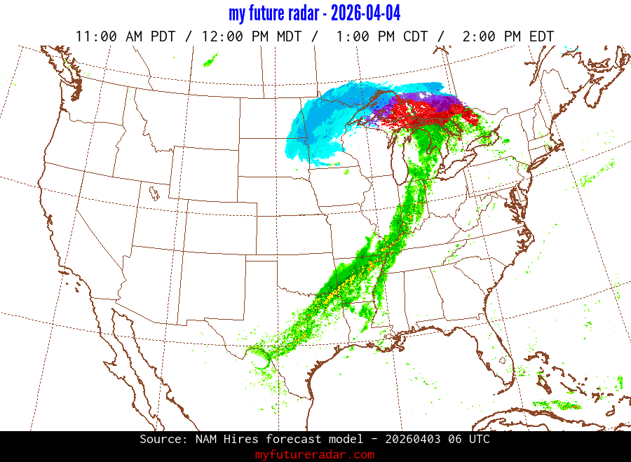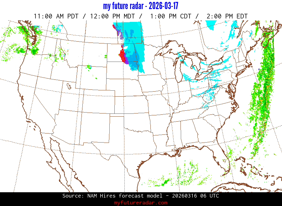 My Future Radar uses data from the Rapid Refresh and the NAM forecast models to provide simulated future radar imagery.